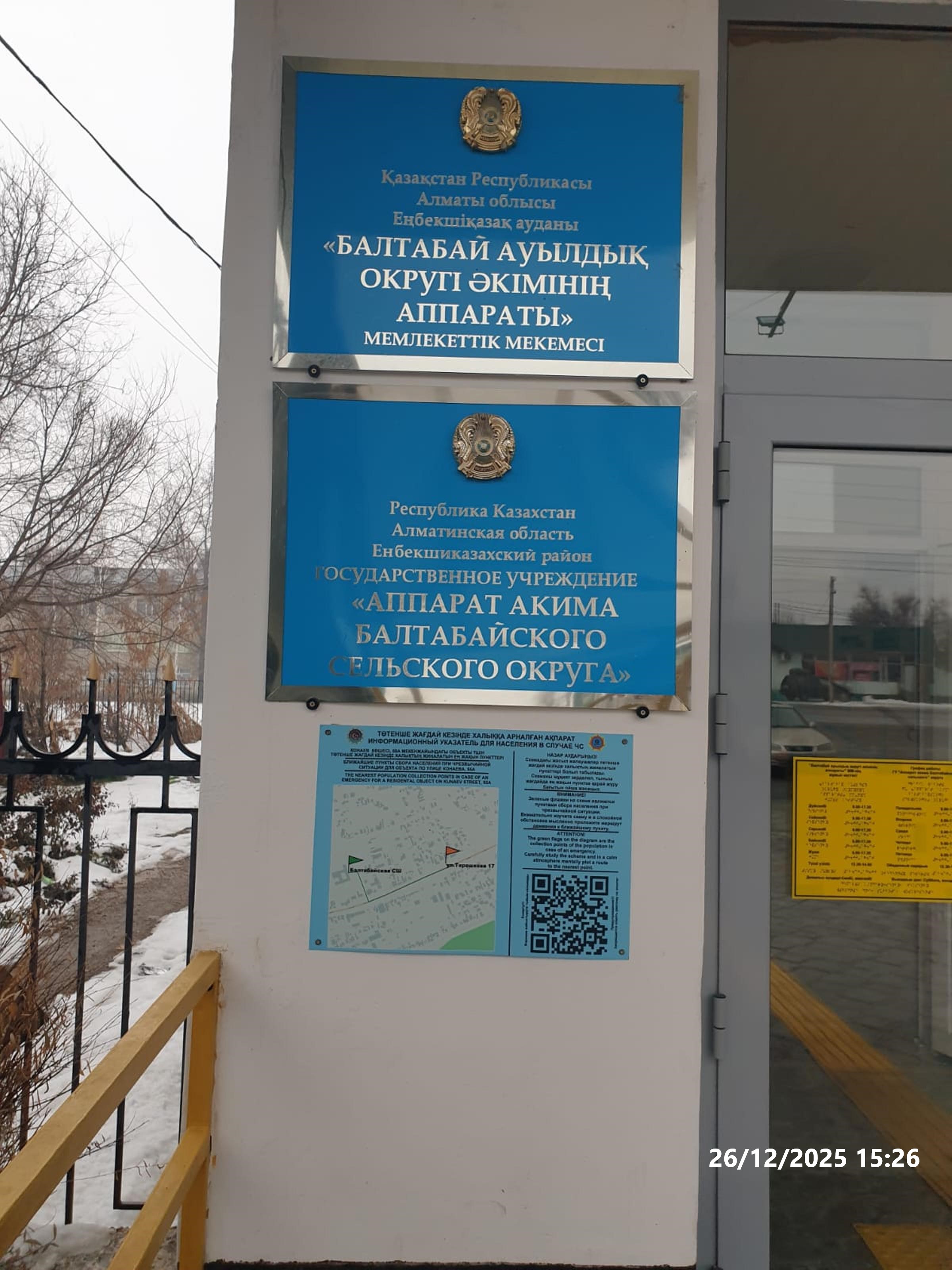 | 1 | Алматинская область, Енбекшиказахский район, Балтабайский с.о. |