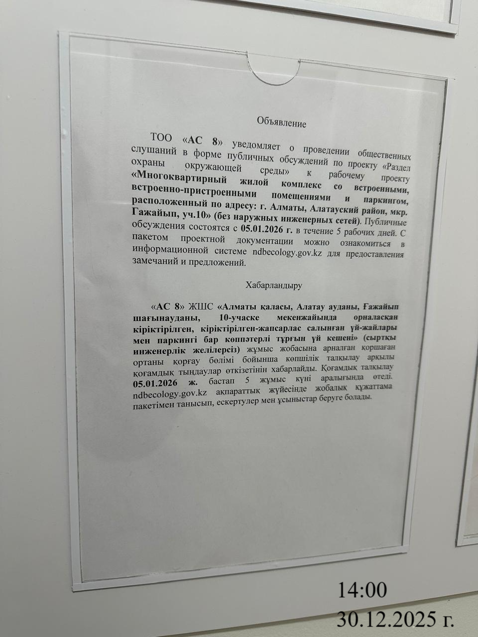 По проекту: «Многоквартирный жилой комплекс со встроенными, встроенно-пристроенными помещениями и паркингом, расположенный по адресу: г. Алматы, Алатауский район, мкр. Гажайып, уч.10» (без наружных инженерных сетей)