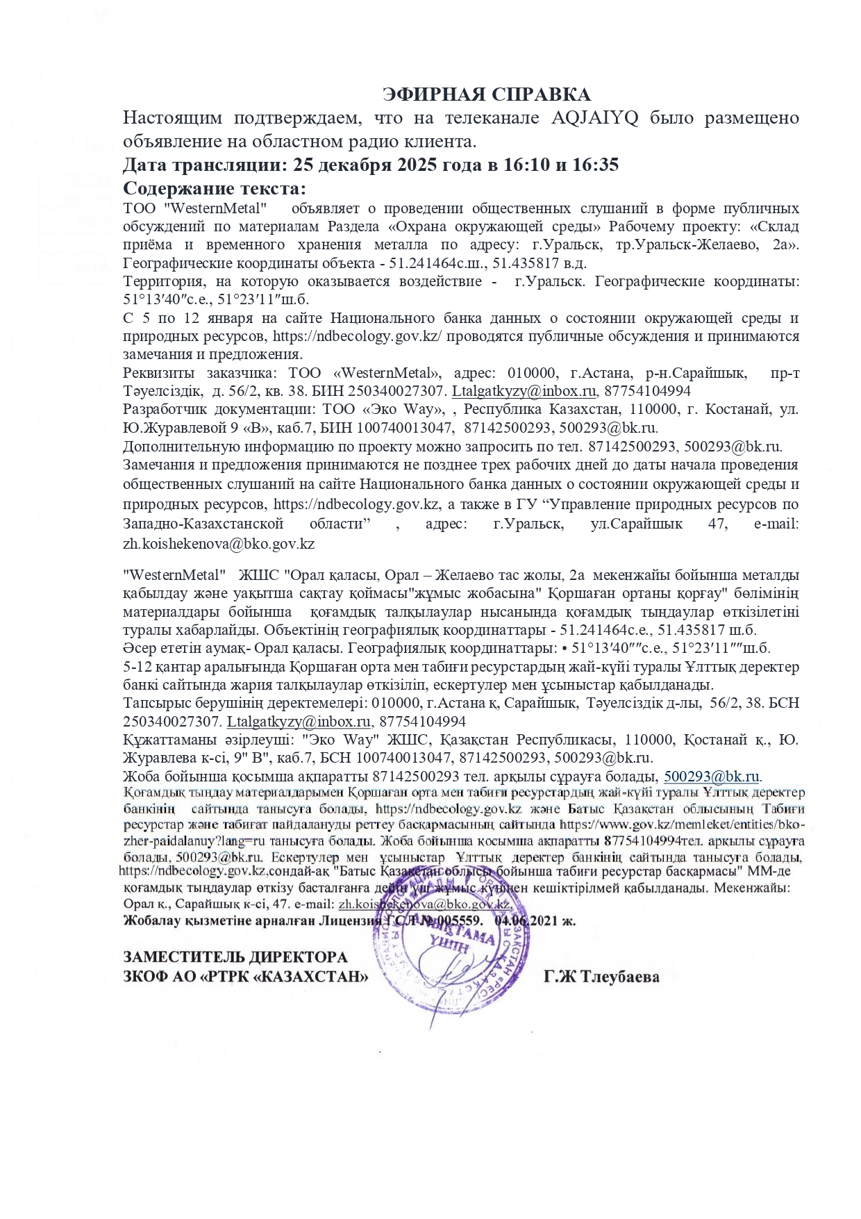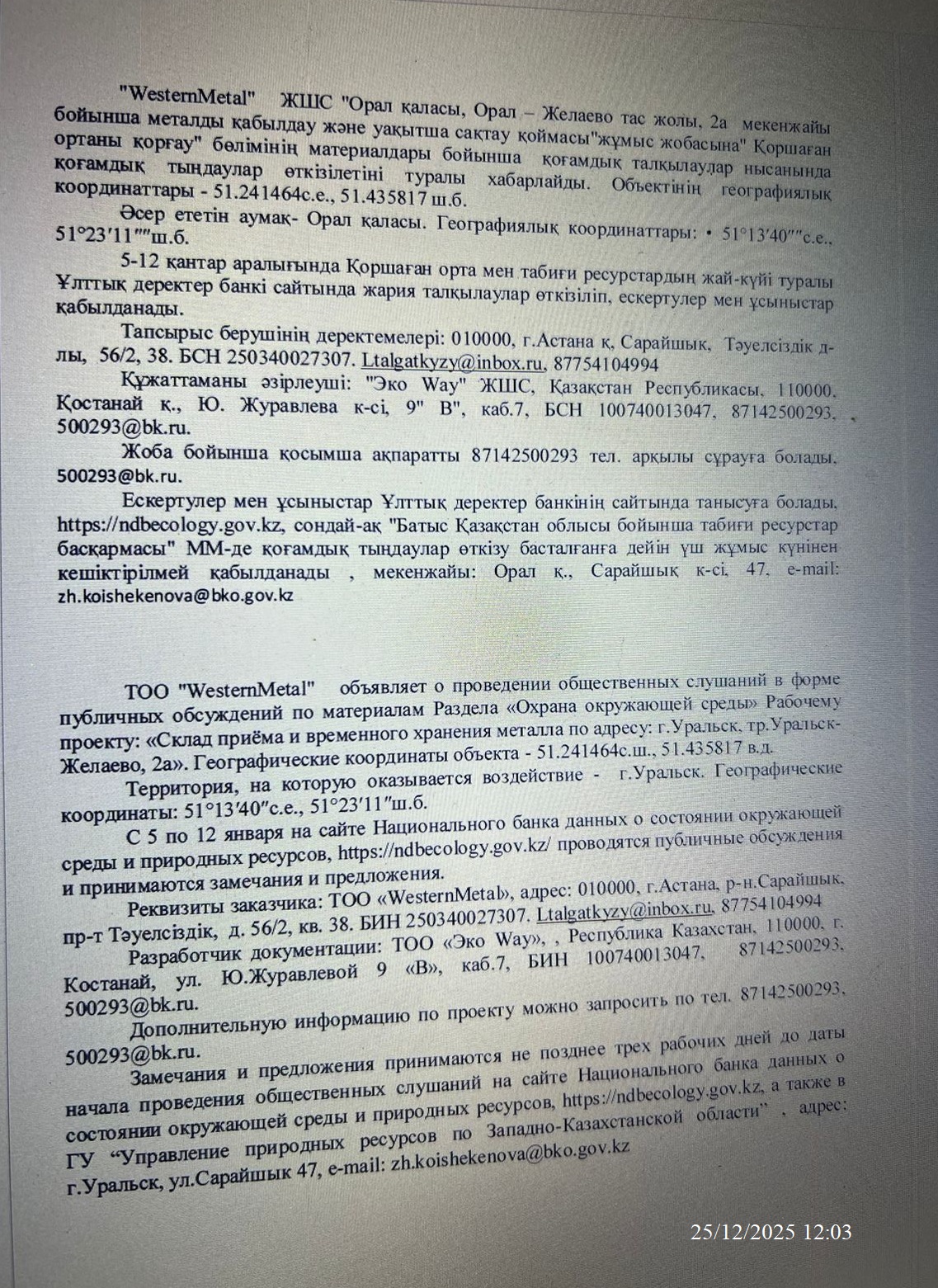 1. Инициатор: Товарищество с ограниченной ответственностью ""WesternMetal""