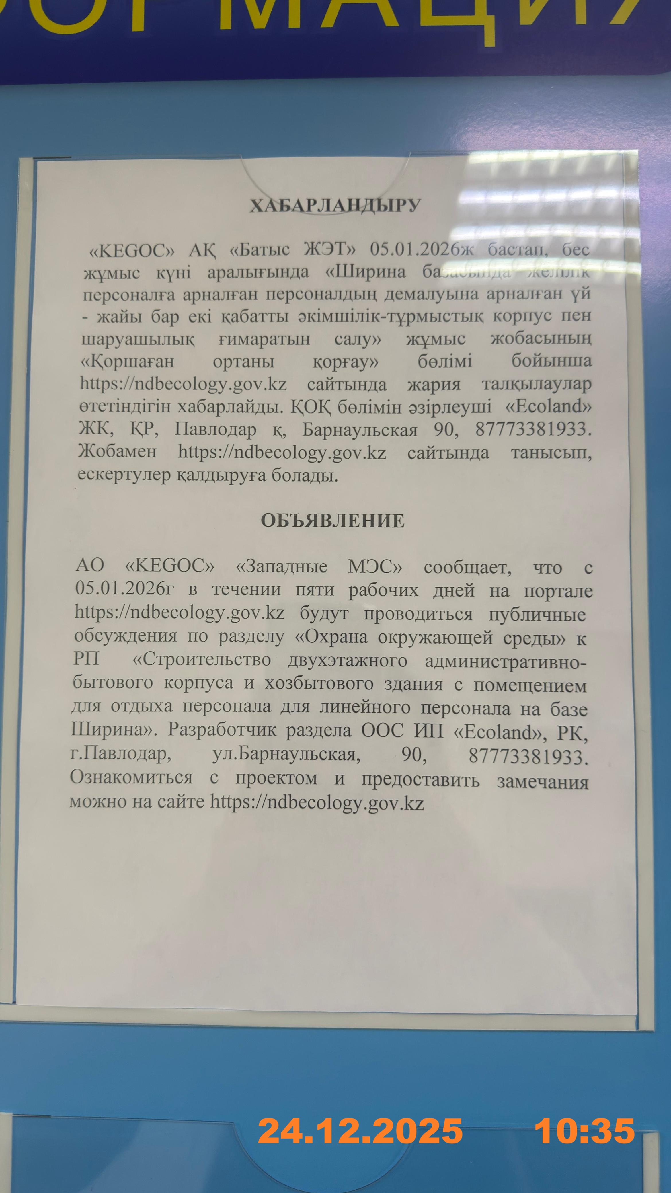 По проекту: РАЗДЕЛ ОХРАНА ОКРУЖАЮЩЕЙ СРЕДЫ к рабочему проекту «Строительство двухэтажного административнобытового корпуса и хозбытового здания с помещением для отдыха персонала для линейного персонала на базе Ширина»