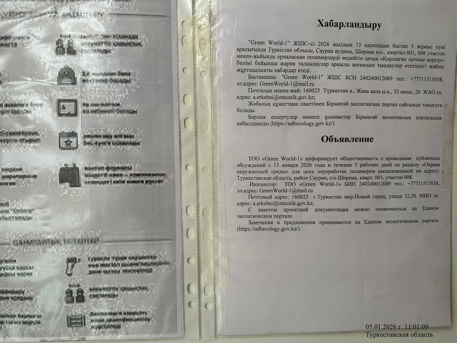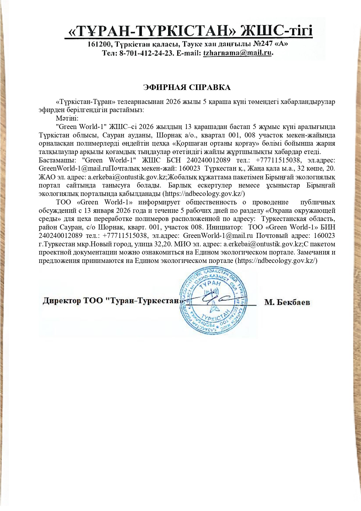 По проекту: РАЗДЕЛ «Охрана окружающей среды» для цеха переработке полимеров расположенной по адресу: Туркестанская область, район Сауран, с/о Шорнак, кварт. 001, участок 008