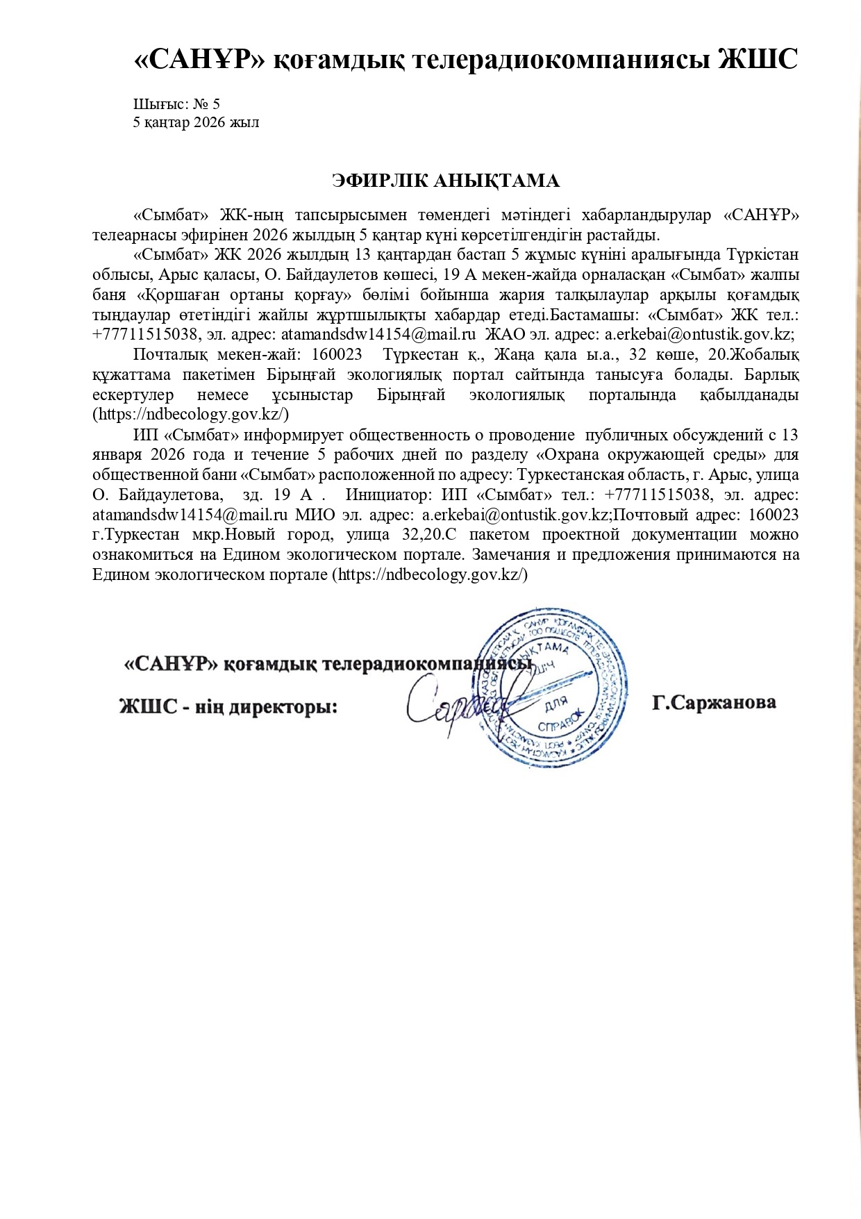 По проекту: РАЗДЕЛ «Охраны окружающей среды» для общественной бани «Сымбат» расположенной по Туркестанская область, г. Арыс, улица Байдаулетова Оспан, здание 19 А