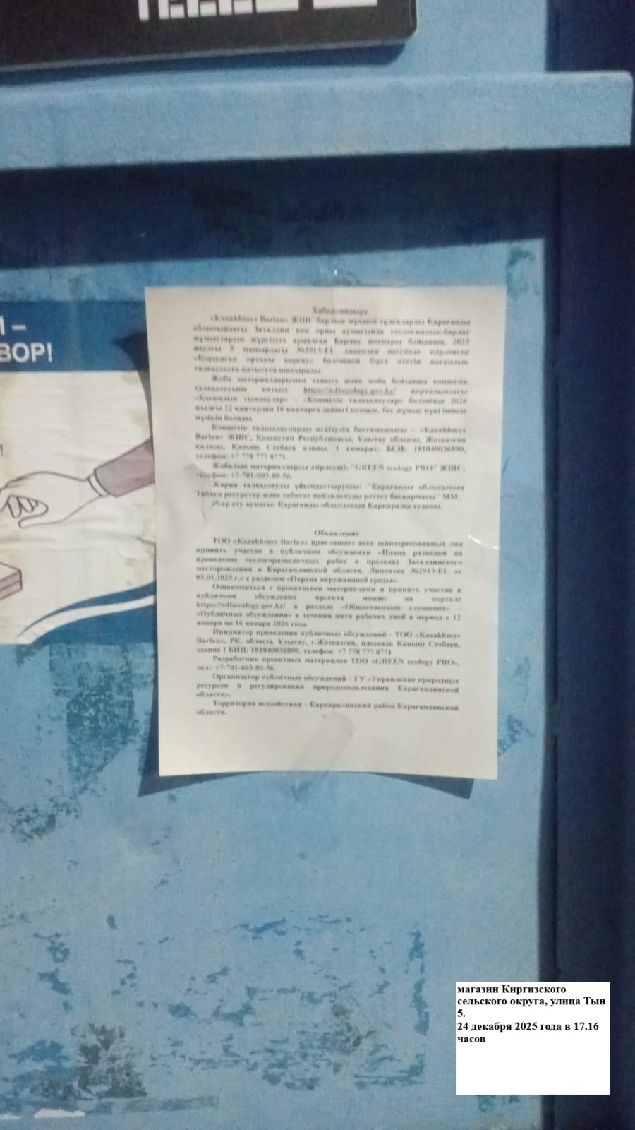 По проекту: План разведки на проведение геологоразведочных работ в пределах Заталдинского месторождения в Карагандинской области. Лицензия №2913-EL от 05.05.2025 г.» с разделом «Охрана окружающей среды»