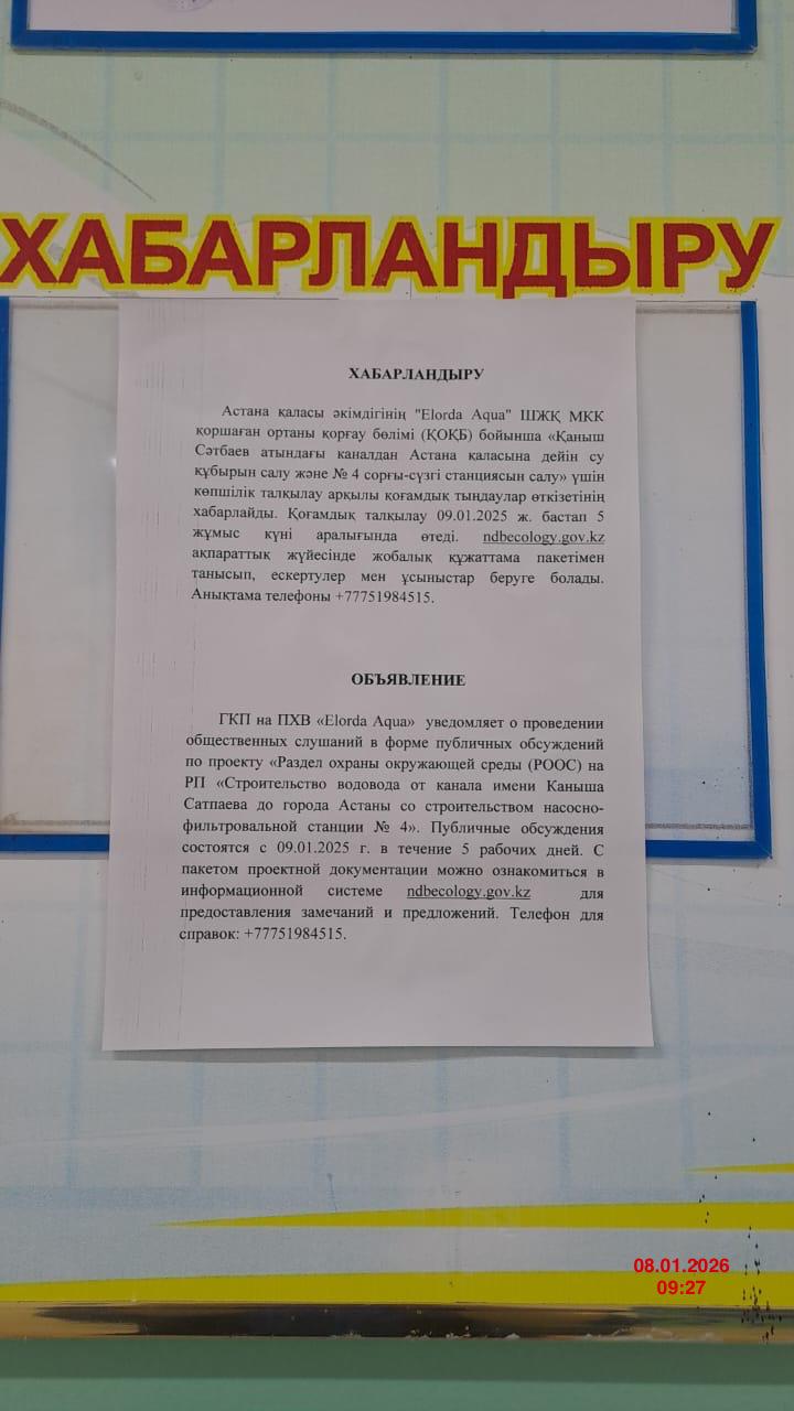 По проекту: Раздел охраны окружающей среды (РООС) к проектной документации «Строительство водовода от канала имени Каныша Сатпаева до города Астаны со строительством насосно-фильтровальной станции №4»