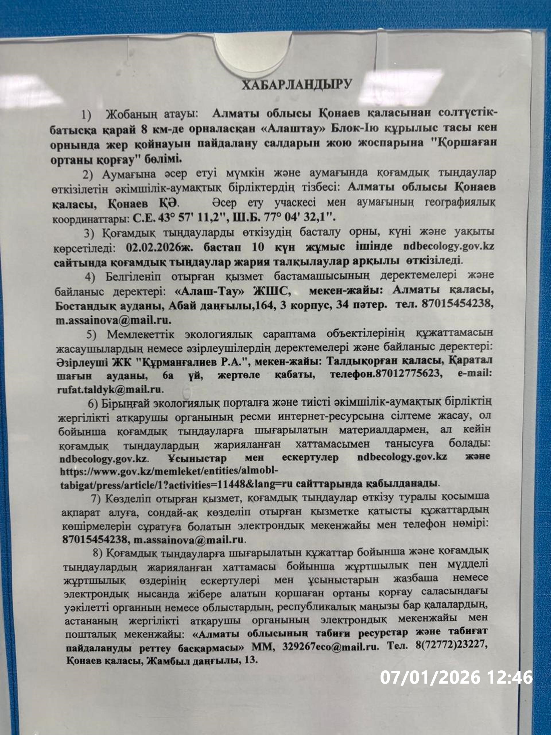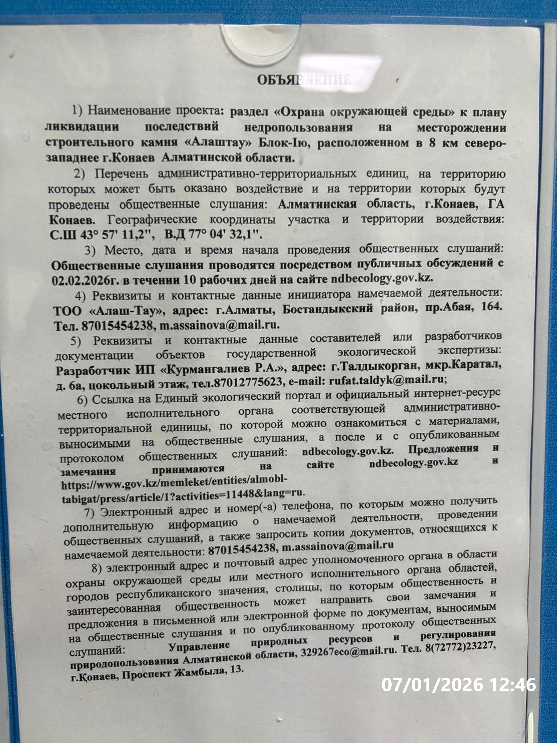 По проекту: План ликвидации последствий недропользования на месторождении строительного камня «Алаштау» Блок Iю, расположенном на землях административно-территориального подчинения г.Конаев Алматинской области