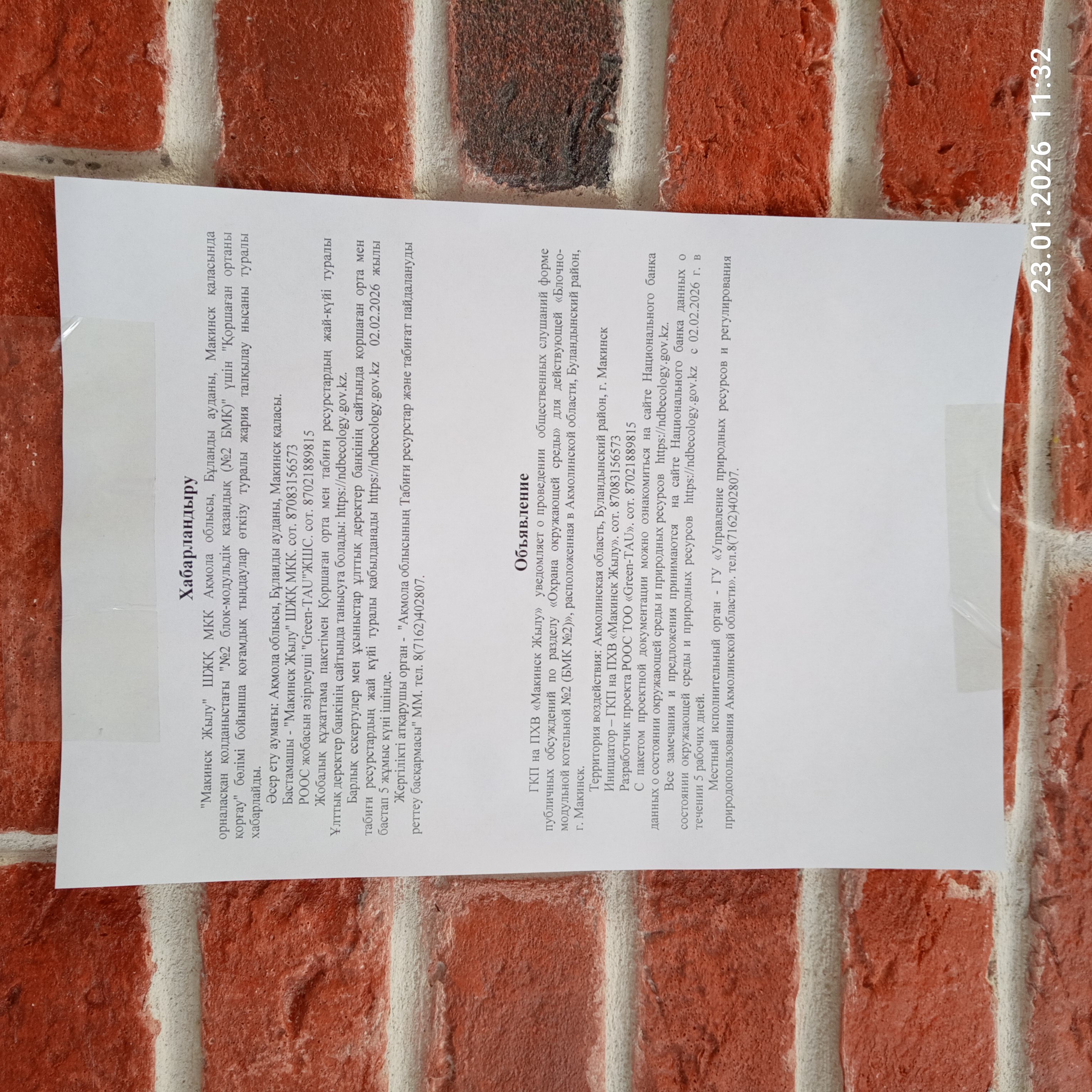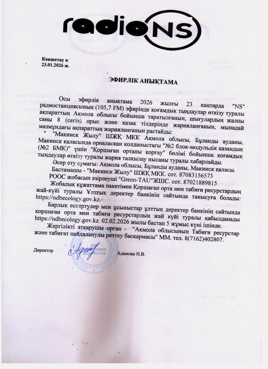 4.2. Дополнительная информация о административно-территориальных единиц: Перечень административно-территориальных единиц на территорию которых может быть оказано воздействие и на территории которых будут проведены общественные слушания (если общественные слушания по одному и тому же предмету слушаний проводятся более чем в одной административно-территориальной единице): Акмолинская область, Буландынский район, г. Макинск.