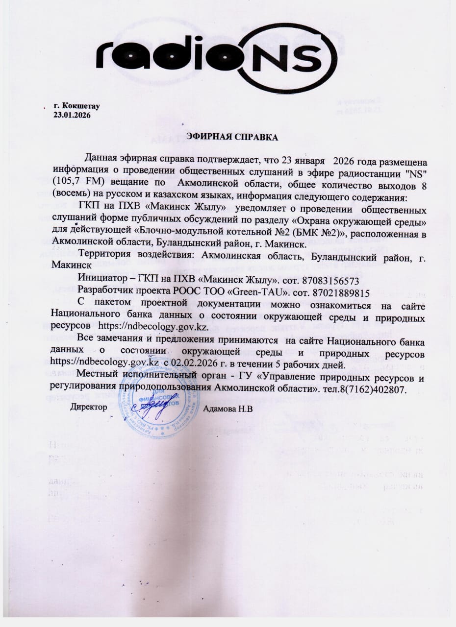 По проекту: Раздел «Охрана окружающей среды» для действующей «Блочно-модульной котельной №2 (БМК №2)», расположенная в Акмолинской области, Буландынский района, г. Макинск