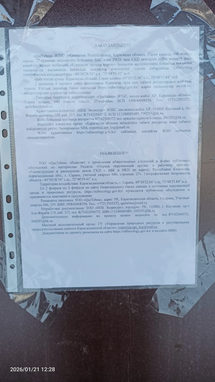 По проекту: Раздел «Охрана окружающей среды» к рабочему проекту «Реконструкция и расширение цехов CKD с АБК и DKD по адресу: Республика Казахстан, Карагандинская обл., г. Сарань, учетный квартал 046, строение 27».