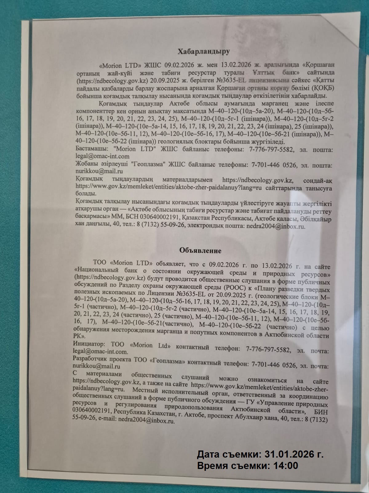 По проекту: Раздел охраны окружающей среды к "Плану разведки твердых полезных ископаемых по Лицензии №3635-ЕL от 20.09.2025 г. (геологические блоки М–40–120-(10д–5а-20), М–40–120-(10д–5б-16, 17, 18, 19, 20, 21, 22, 23, 24, 25), М–40–120-(10д–5г-1 (частично), М–40–120-(10д–5г-2 (частично), М–40–120-(10е–5а-14, 15, 16, 17, 18, 19, 20, 21, 22, 23, 24 (частично), 25 (частично), М–40–120-(10е–5б-11, 12), М–40–120-(10е–5б-16, 17), М–40–120-(10е–5б-21(частично), М–40–120-(10е–5б-22 (частично) с целью обнаружения месторождения марганца и попутных компонентов в Актюбинской области РК"