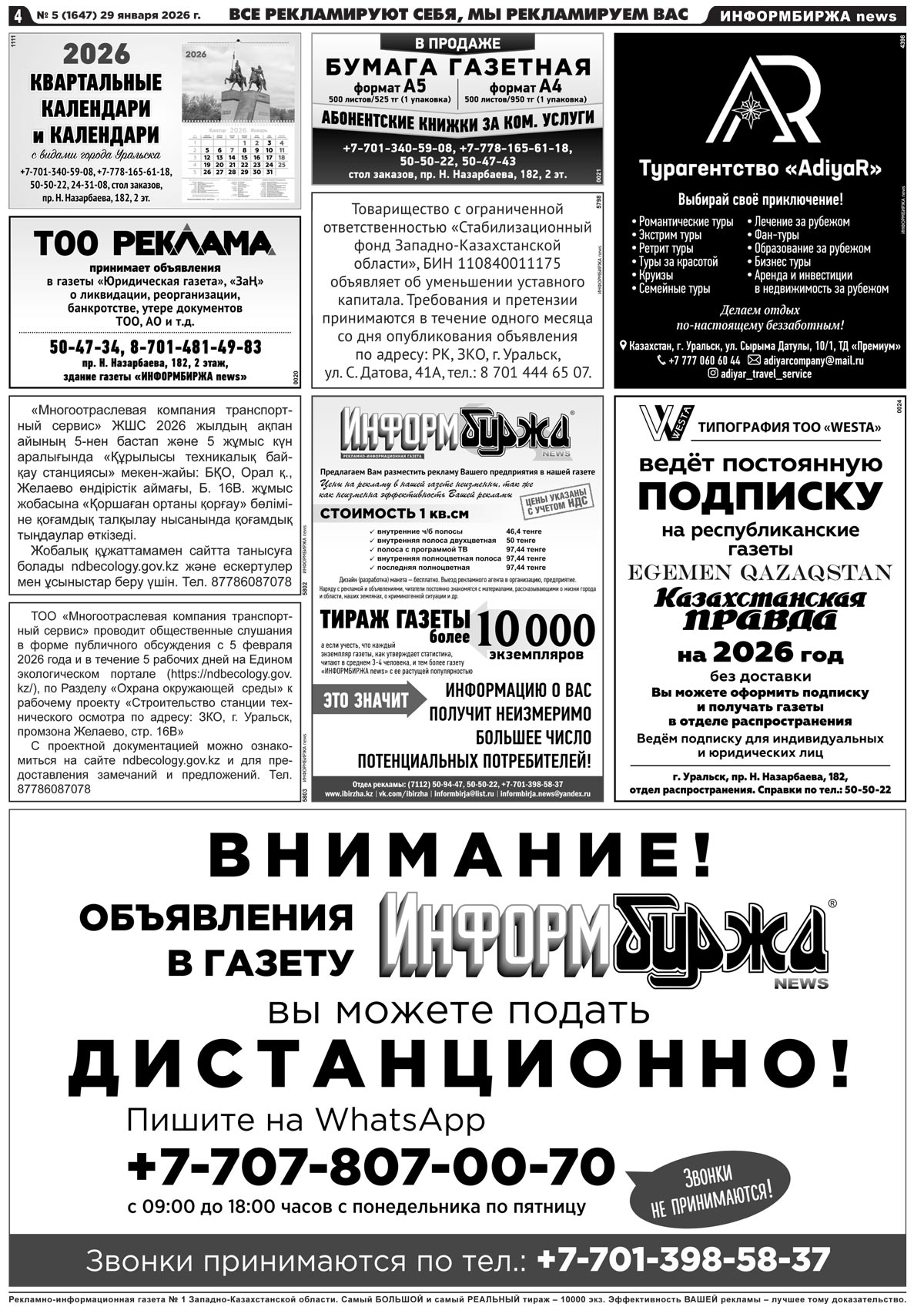 | 1 | Западно-Казахстанская область, Уральск Г.А., г.Уральск |