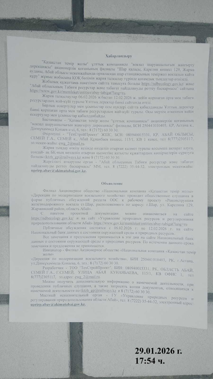 По проекту: «Реконструкция железнодорожного вокзала ст.Шар, расположенного по адресу: г.Шар, ул. Карелина 129, Жарминский район, область Абай»