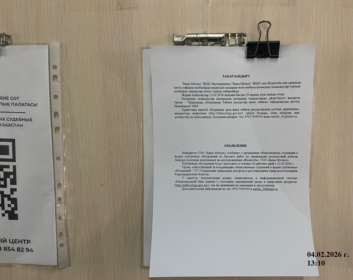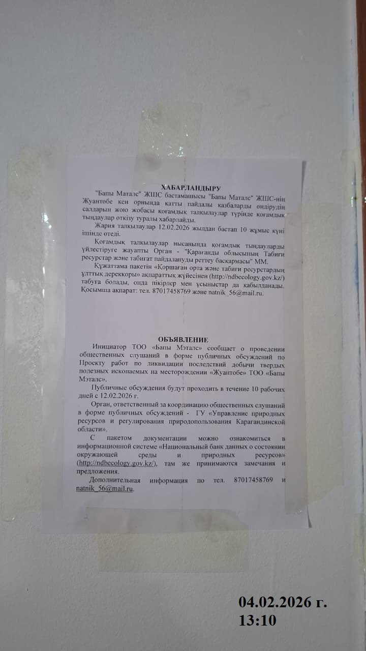 По проекту: Проект работ ликвидации последствий добычи твердых полезных ископаемых на месторождении Жуантобе