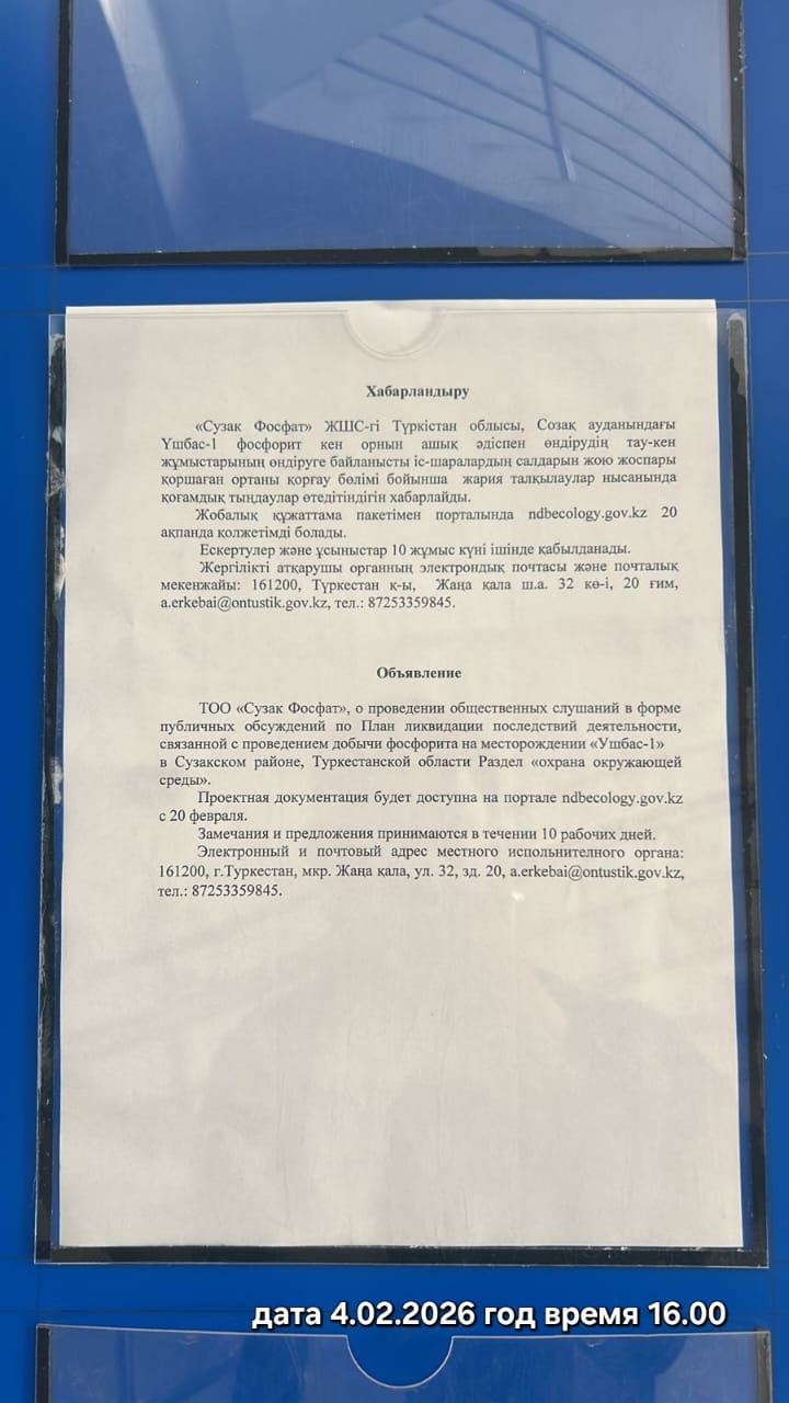 По проекту: План ликвидации последствий деятельности, связанной с проведением добычи фосфорита на месторождении «Ушбас-1» в Сузакском районе, Туркестанской области Раздел «охрана окружающей среды».