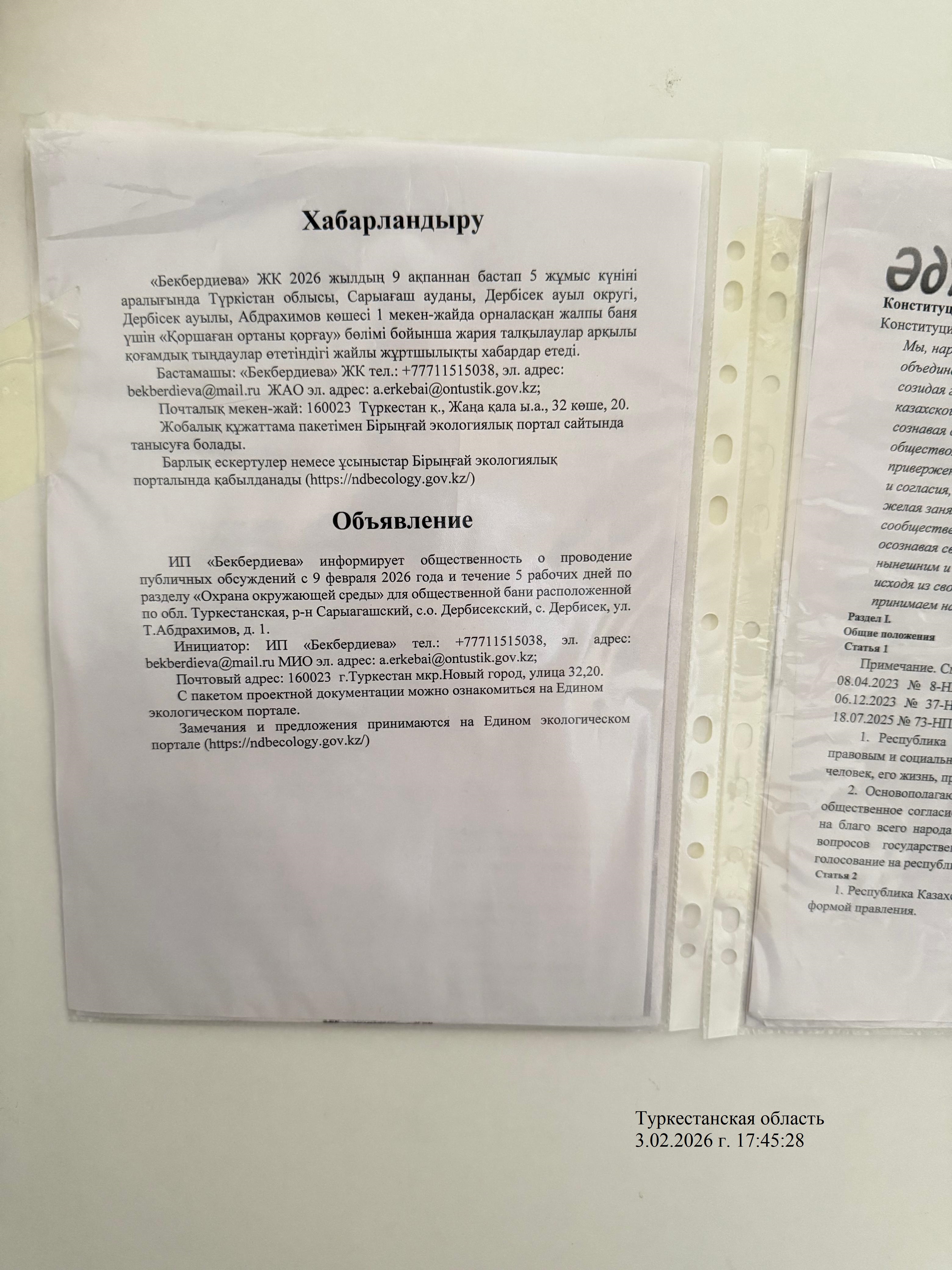 По проекту: РАЗДЕЛ «Охраны окружающей среды» для общественной бани ИП «Бекбердиева» расположенной по адресу: обл. Туркестанская, р-н Сарыагашский, с.о. Дербисекский, с. Дербисек, ул. Т. Абдрахимов, д. 1