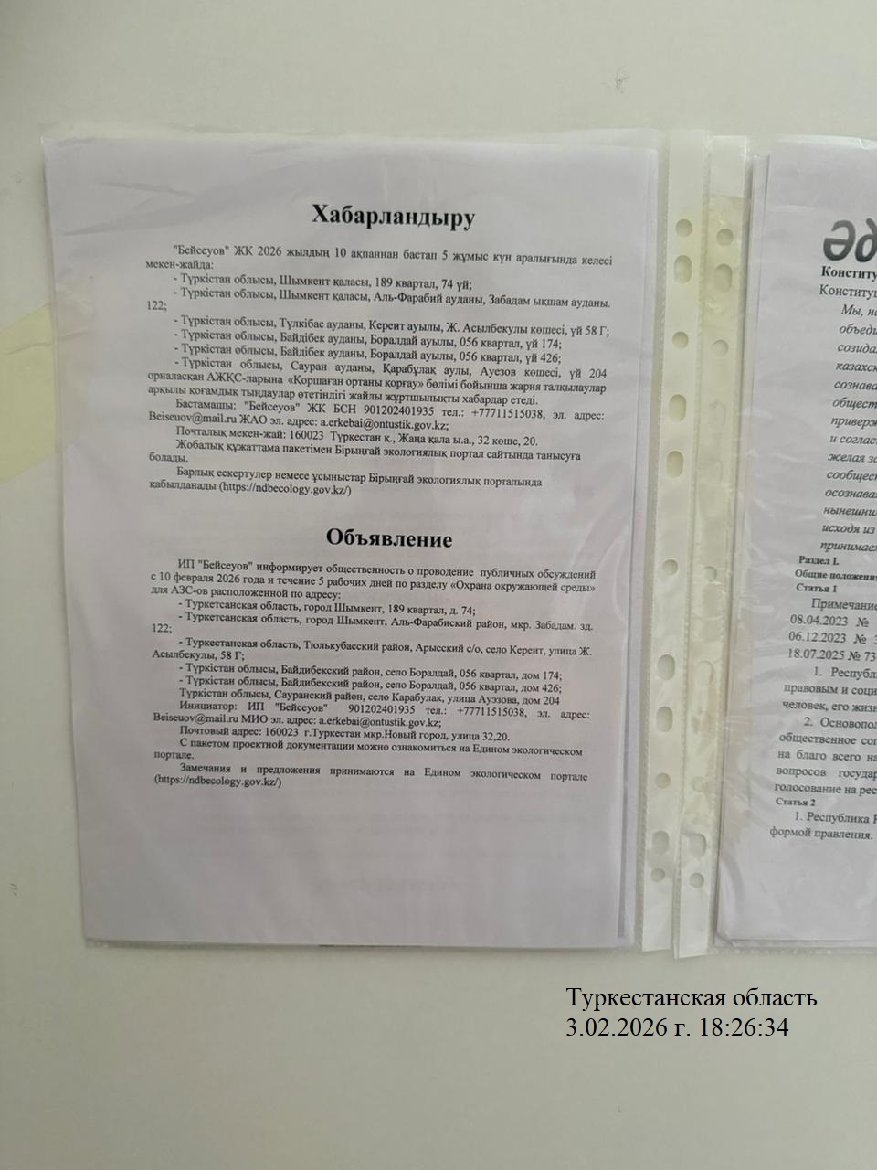 По проекту: РАЗДЕЛ «Охраны окружающей среды» для АГЗС ИП "Бейсеуов" (по адресу Туркестанская область, Байдибекский район, Боралдайский с/о, 056 квартал, участок 714)