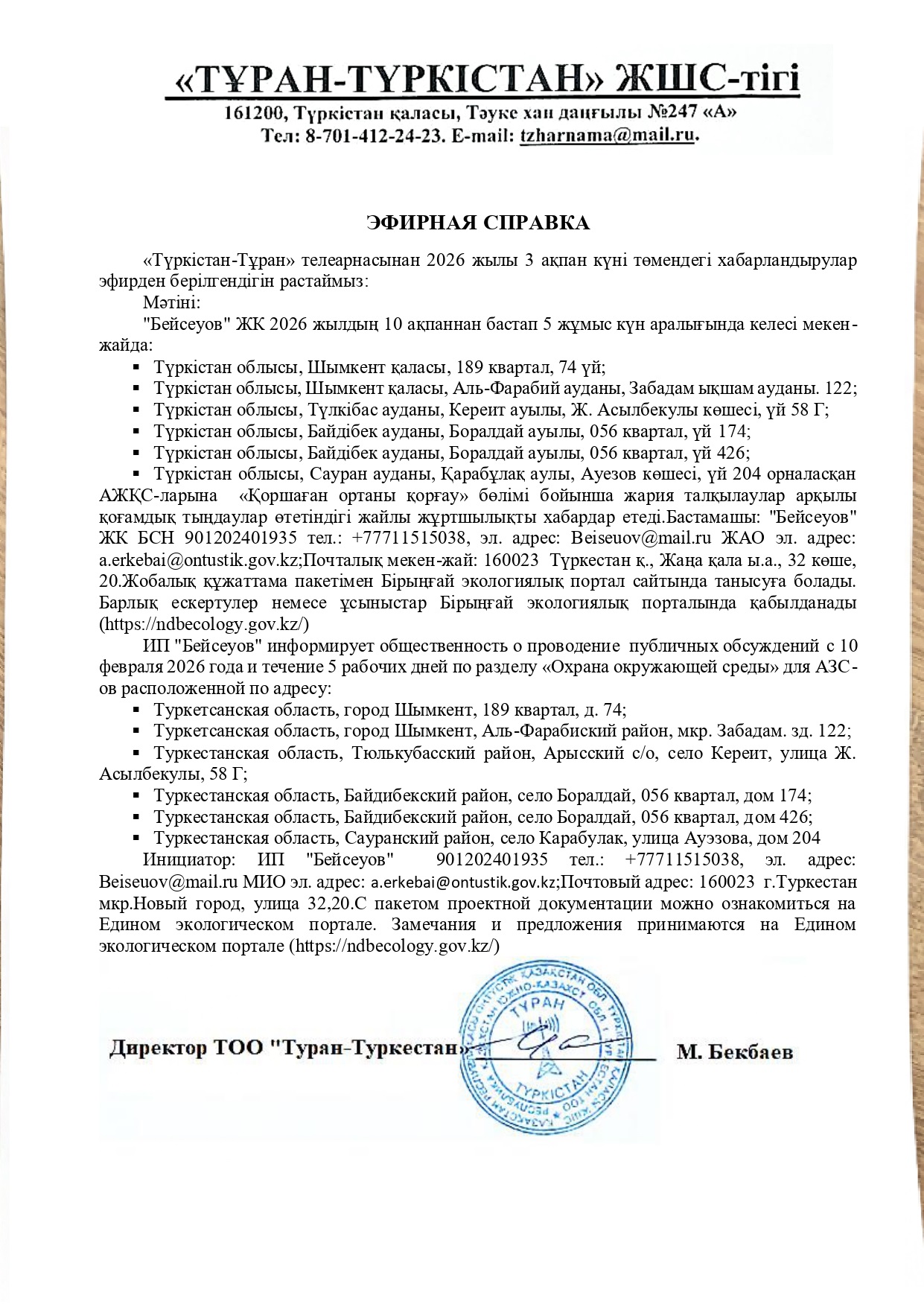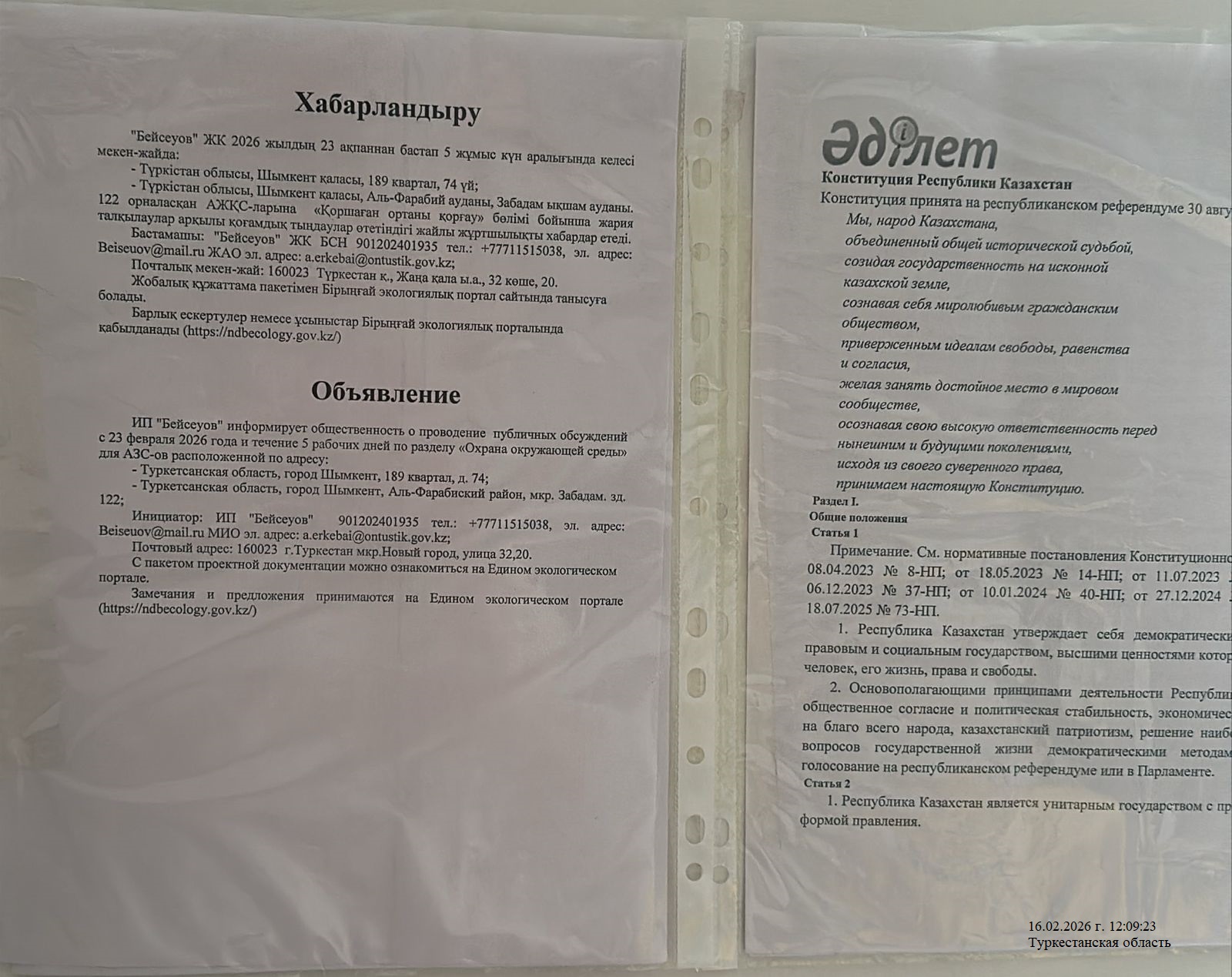 По проекту: РАЗДЕЛ «Охраны окружающей среды» для АГЗС ИП "Бейсеуов" (по адресу Туркестанская область, город Шымкент, Аль-Фарабиский район, мкр. Забадам. зд. 122)
