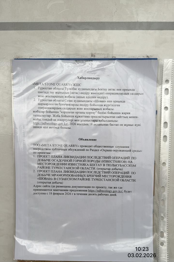По проекту: ПРОЕКТ ПЛАНА ЛИКВИДАЦИИ ПОСЛЕДСТВИЙ ОПЕРАЦИЙ ПО ДОБЫЧЕ МРАМОРИЗОВАННЫХ БРЕКЧИЙ МЕСТОРОЖДЕНИЯ «ШОВАН» В СУЗАКСКОМ РАЙОНЕ ТУРКЕСТАНСКОЙ ОБЛАСТИ.