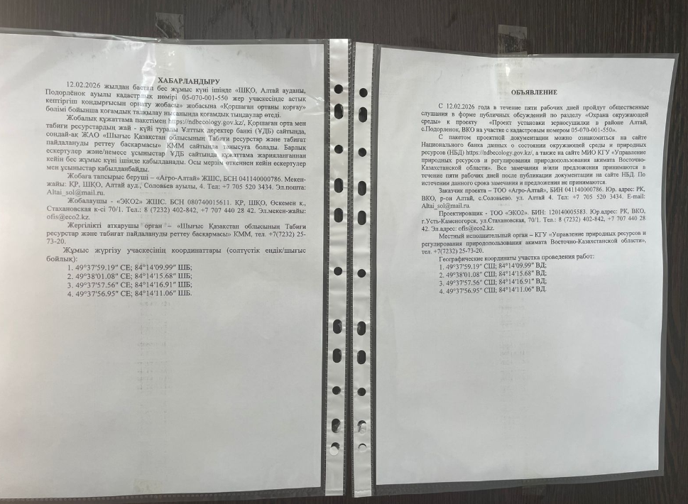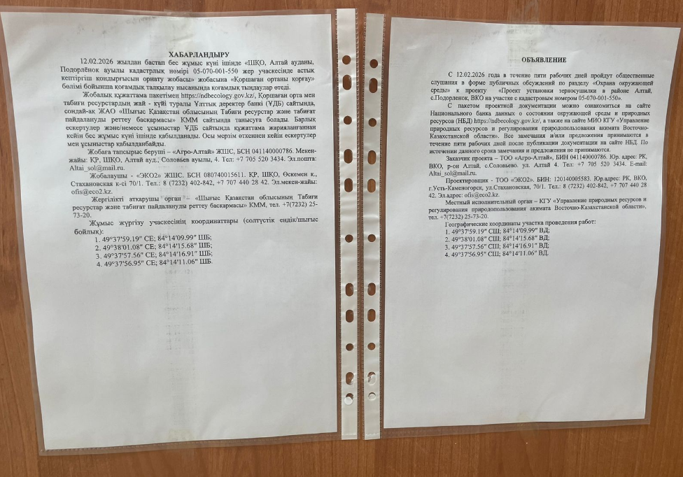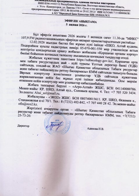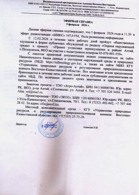 По проекту: «Проект установки зерносушилки в районе Алтай, с.Подорленок, ВКО на участке с кадастровым номером 05-070-001-550»