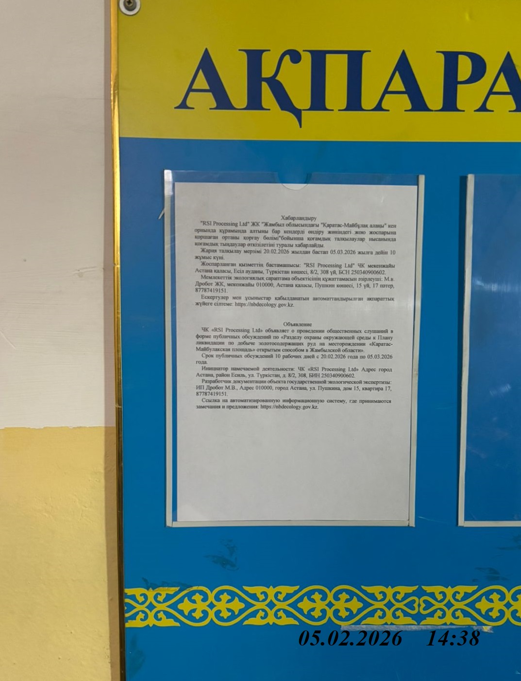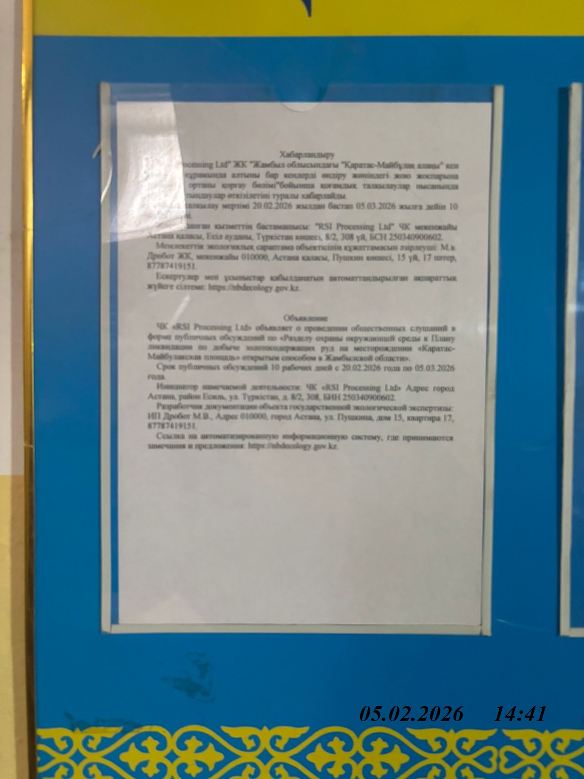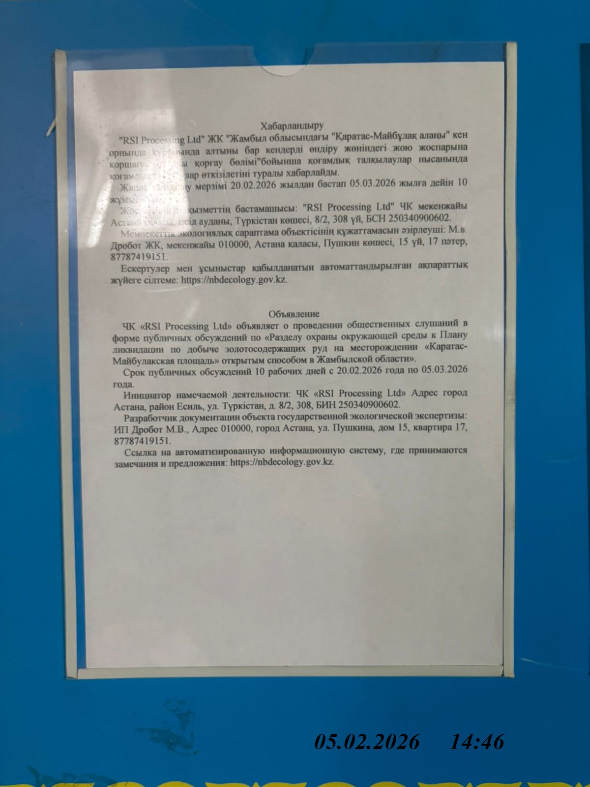 По проекту: Раздел охраны окружающей среды к Плану ликвидации по добыче золотосодержащих руд на месторождении «Каратас-Майбулакская площадь» открытым способом в Жамбылской области