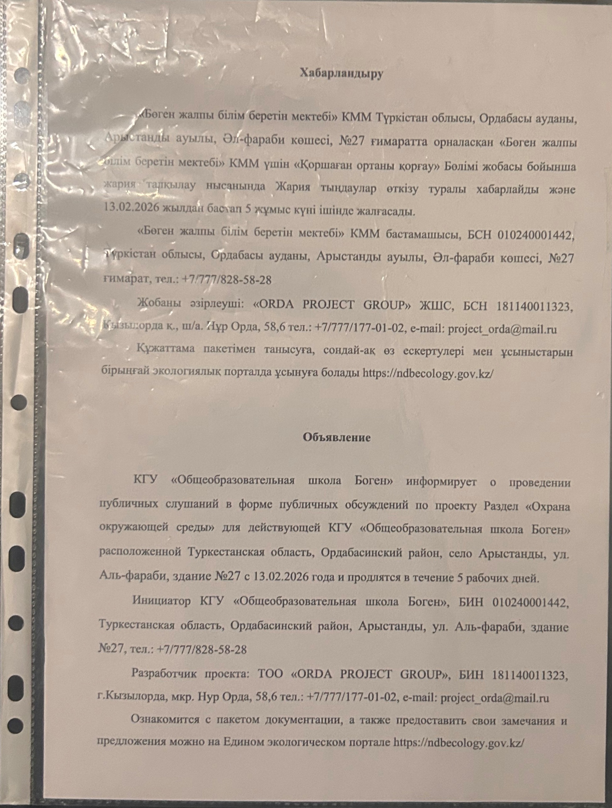 По проекту: Раздел «Охрана окружающей среды» для действующей КГУ «Общеобразовательная школа Боген»