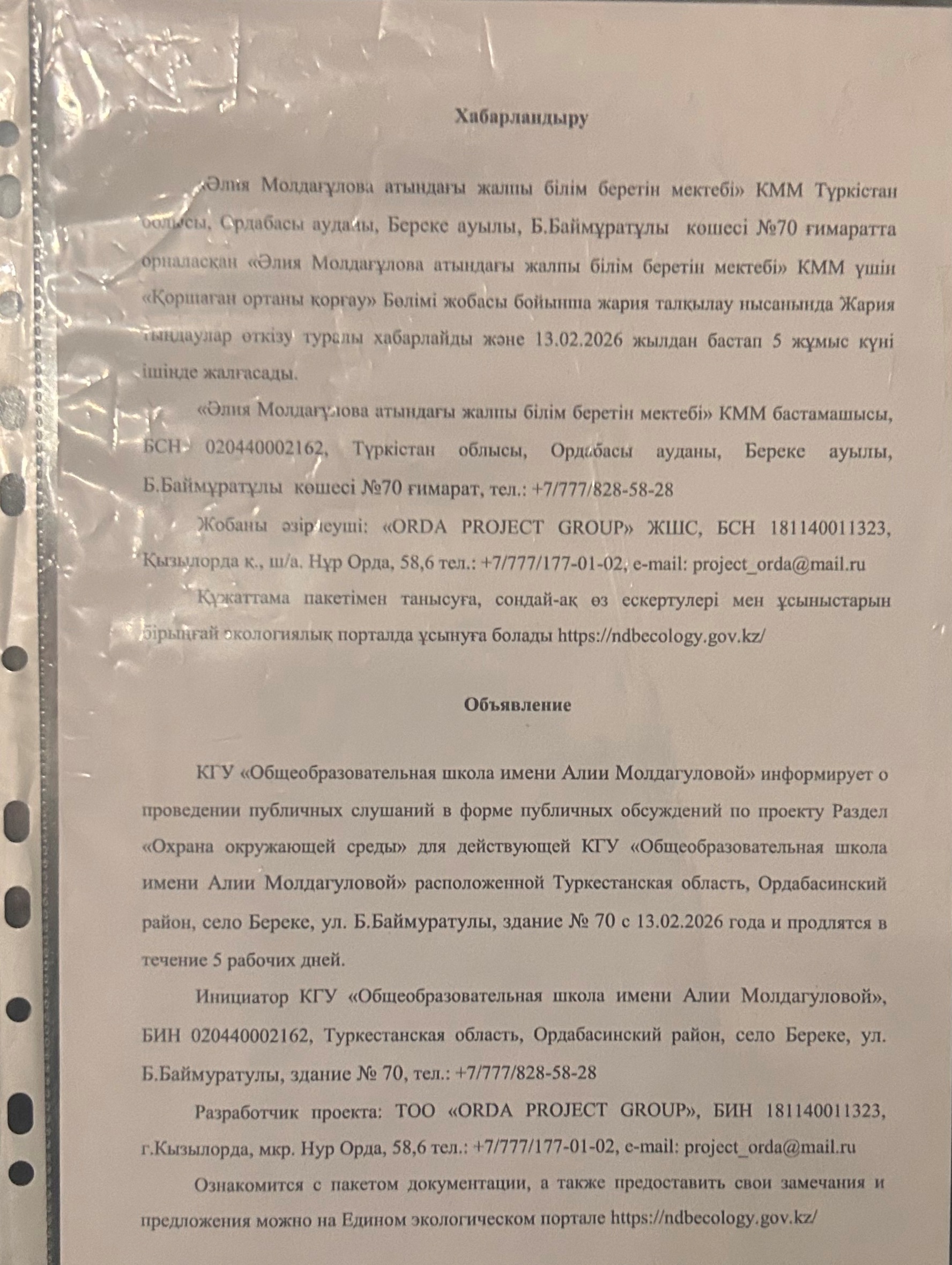 По проекту: проекту Раздел «Охрана окружающей среды» для действующей КГУ «Общеобразовательная школа имени Алии Молдагуловой»