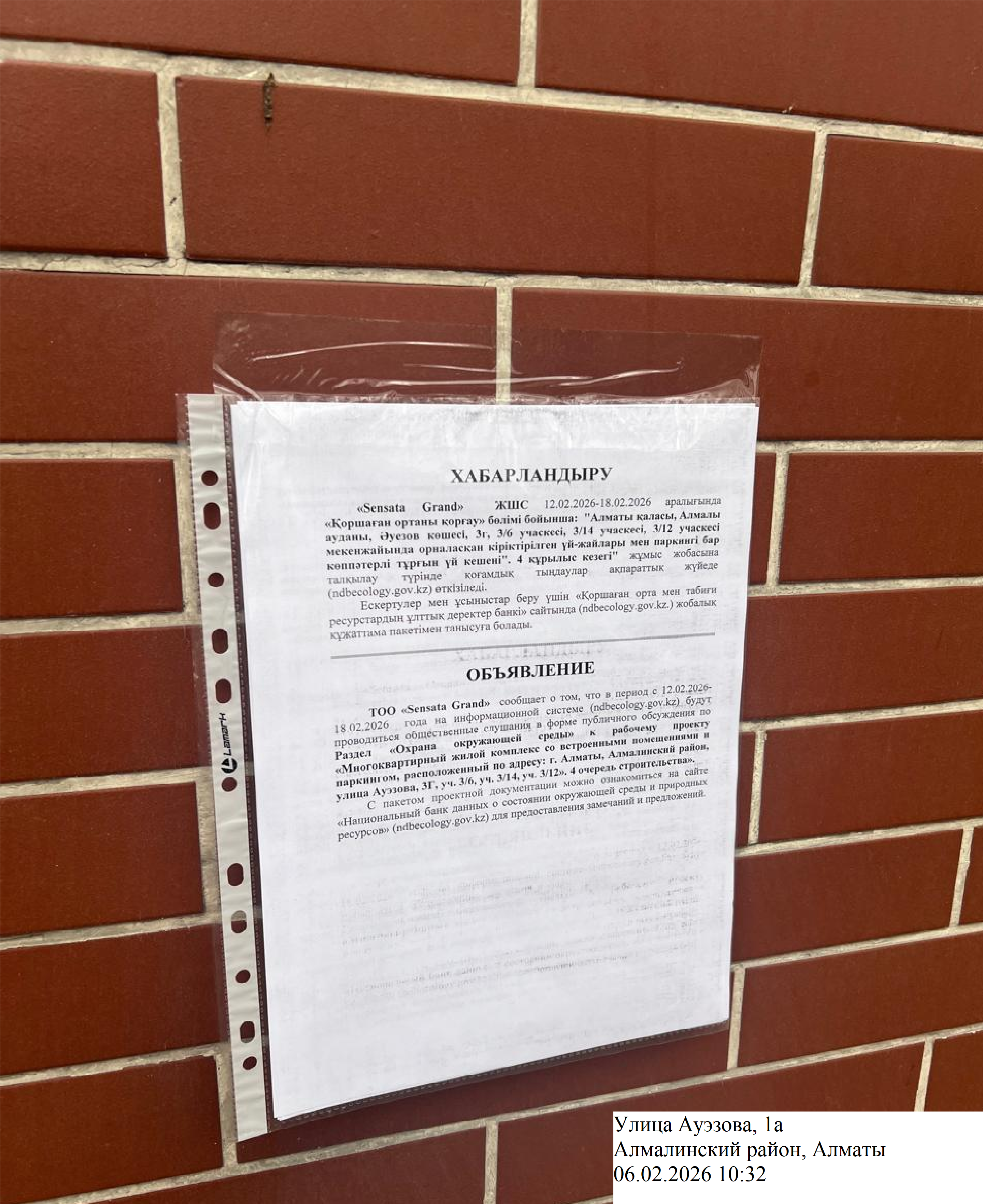 По проекту: Раздел охрана окружающей среды к рабочему проекту «Многоквартирный жилой комплекс со встроенными помещениями и паркингом, расположенный по адресу: г. Алматы, Алмалинский район, улица Ауэзова, 3Г, уч. 3/6, уч. 3/14, уч. 3/12». 4 очередь строительства».