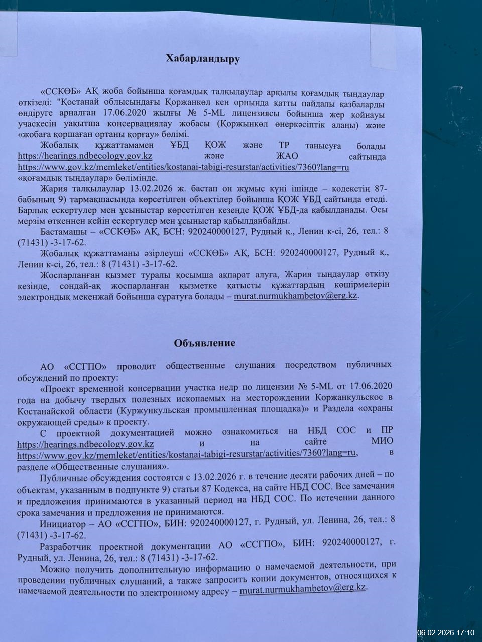 По проекту: «Проект временной консервации участка недр по лицензии № 5-ML от 17.06.2020 года на добычу твердых полезных ископаемых на месторождении Коржанкульское в Костанайской области (Куржункульская промышленная площадка)» c разделом «Охрана окружающей среды» к проекту
