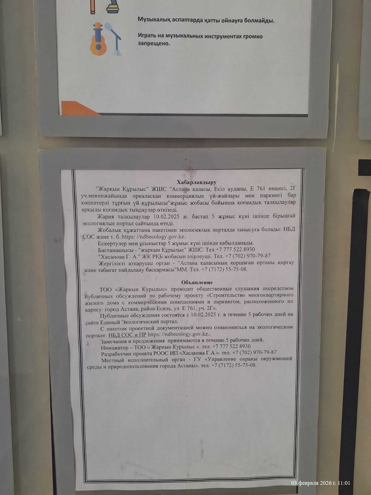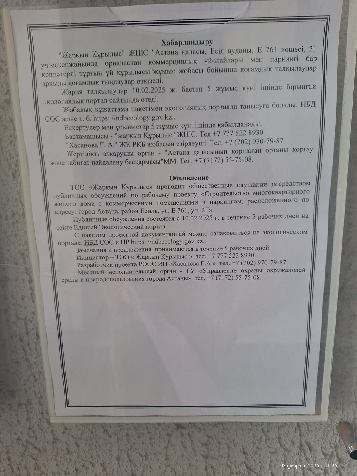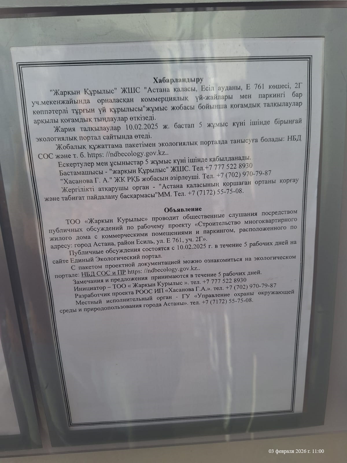 По проекту: РАЗДЕЛ «ОХРАНА ОКРУЖАЮЩЕЙ СРЕДЫ» к рабочему проекту «Строительство многоквартирного жилого дома с коммерческими помещениями и паркингом, расположенного по адресу: город Астана, район Есиль, ул. Е 761, уч. 2Г»