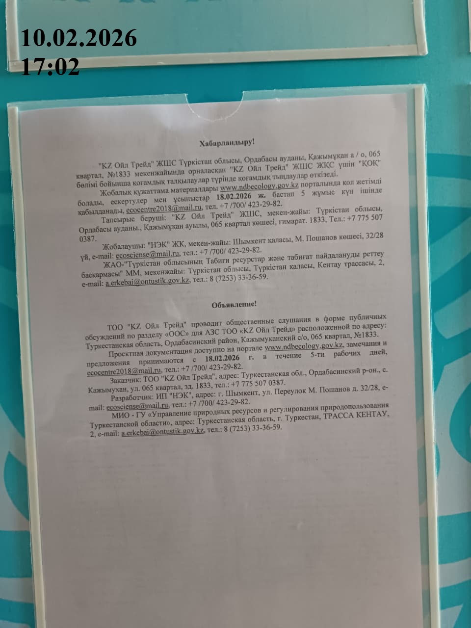 По проекту: РАЗДЕЛ ОХРАНЫ ОКРУЖАЮЩЕЙ СРЕДЫ для АЗС ТОО «KZ Ойл Трейд» расположенной по адресу: Туркестанская область, Ордабасинский район, Кажымуканский с/о, 065 квартал, №1833.