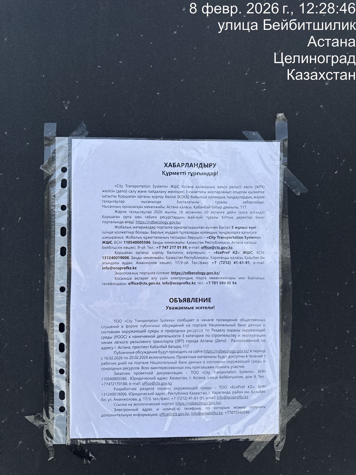 По проекту: Раздел Охраны окружающей среды (РООС) к Рабочему проекту «Новая транспортная система города Астаны. LRT. Очередь І» Депо