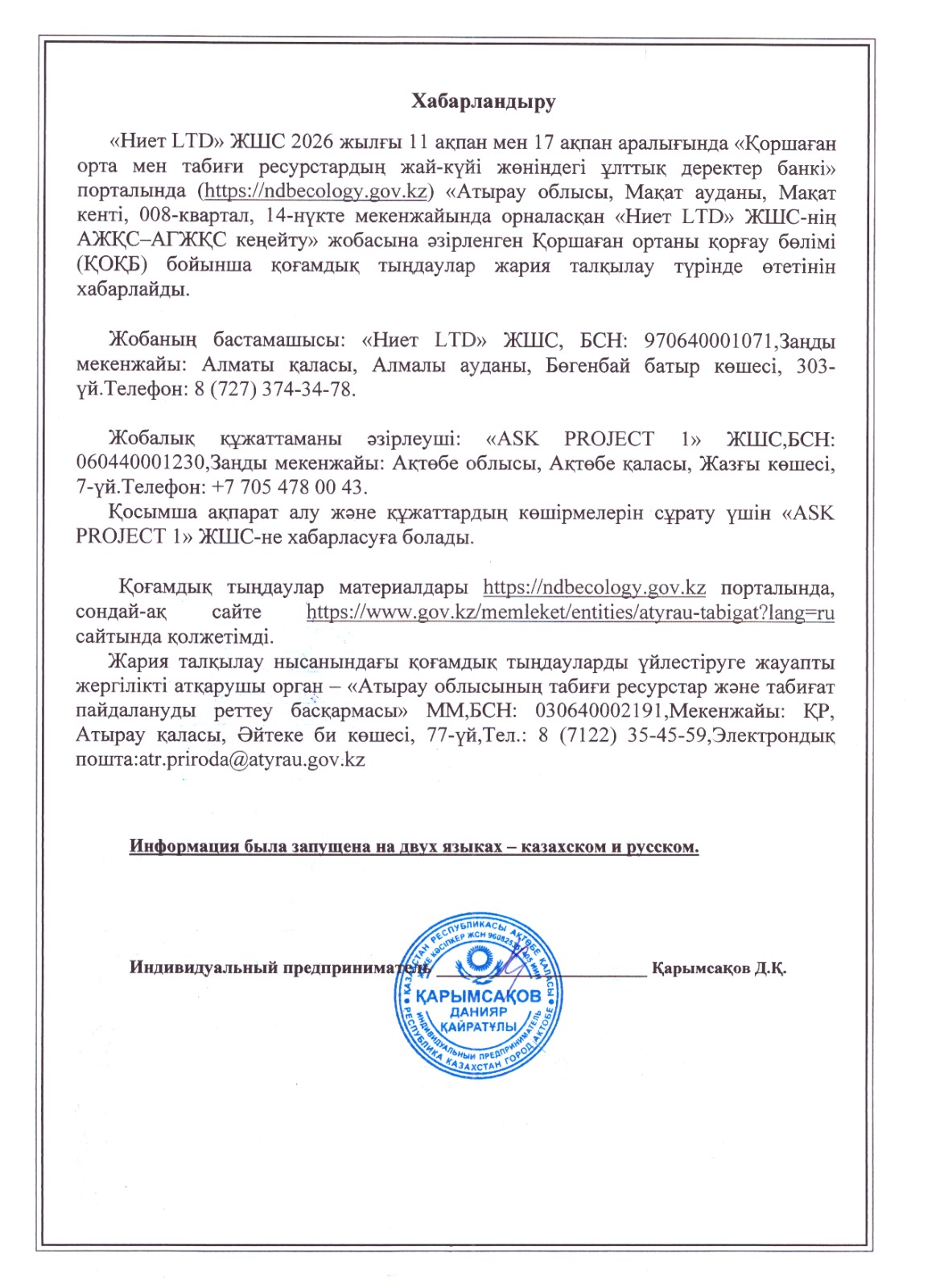 1. Инициатор: Товарищество с ограниченной ответственностью ""НИЕТ ЛТД""