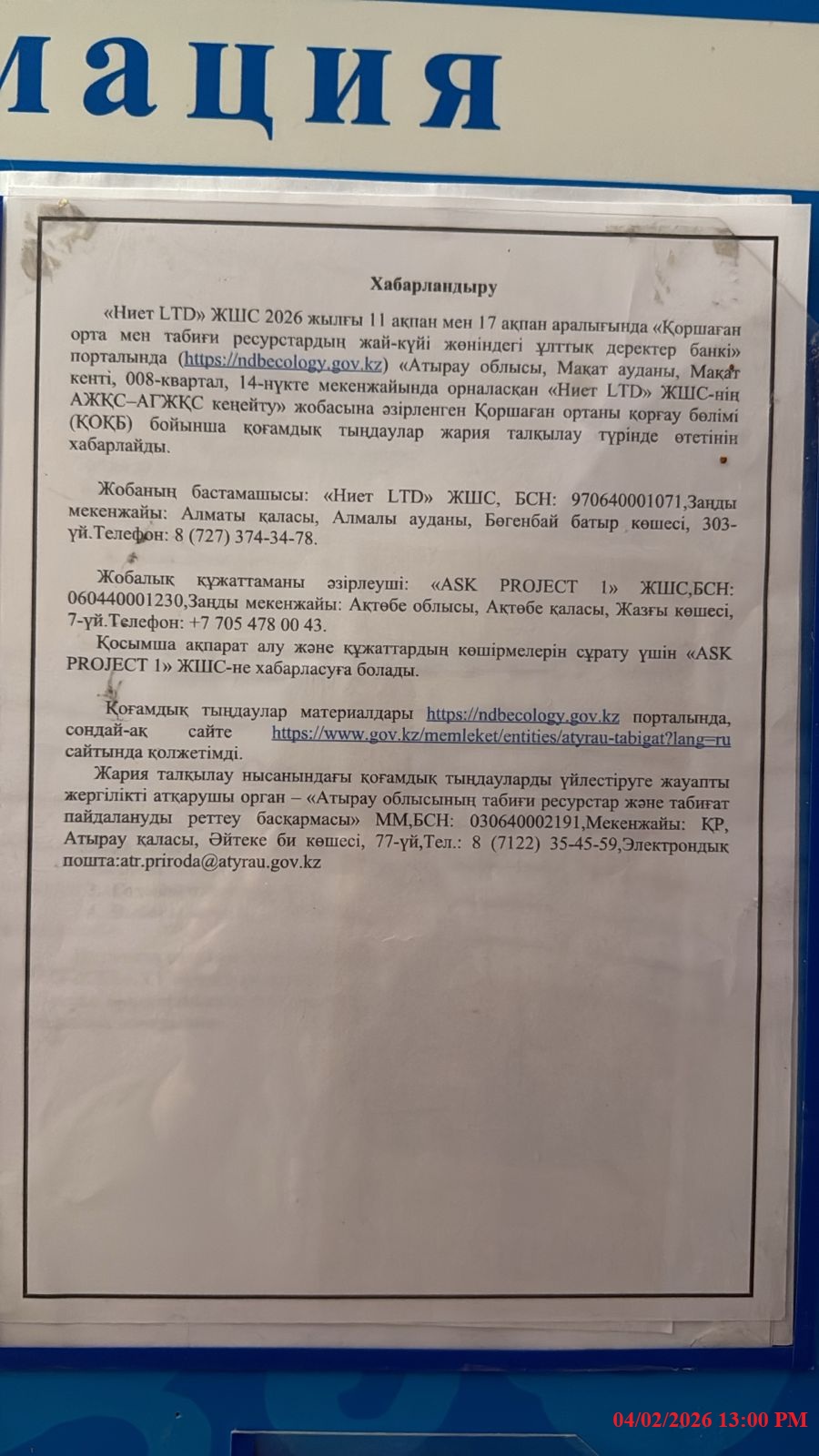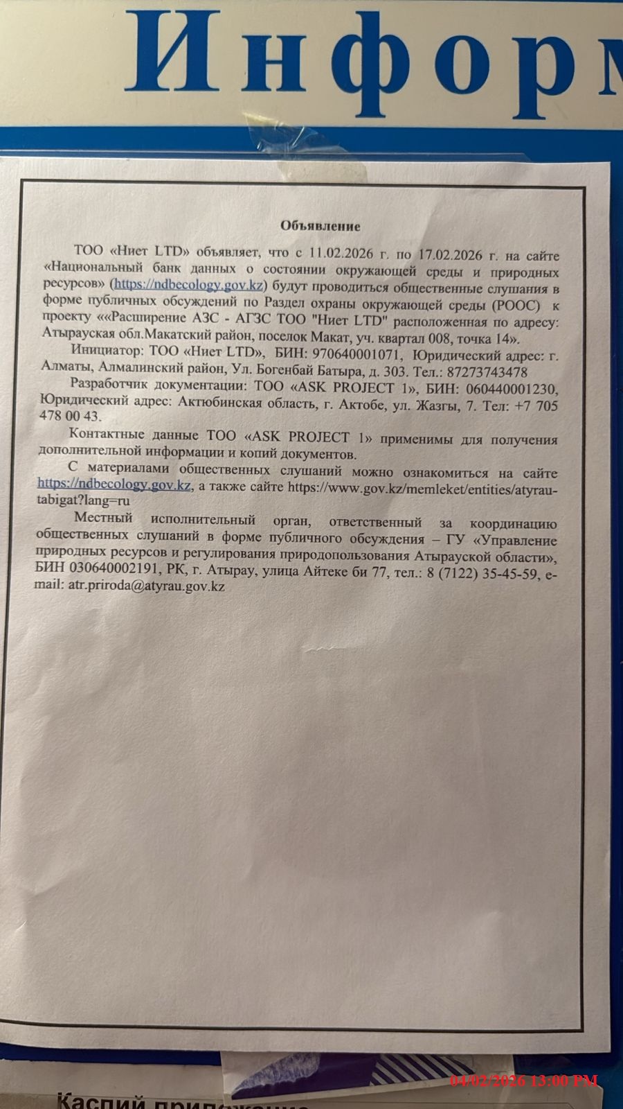 По проекту: Раздел «Охрана окружающей среды» к рабочему проекту «Расширение АЗС - АГЗС ТОО "Ниет LTD" расположенная по адресу: Атырауская обл. Макатский район, поселок Макат, уч. квартал 008, точка 14».