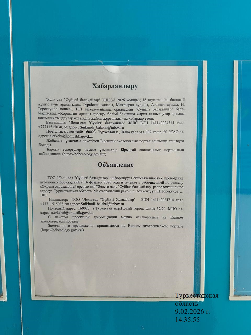 По проекту: РАЗДЕЛ «Охраны окружающей среды» для для Товарищество с ограниченной ответственностью "Ясли-сад "Сүйікті балақайлар" расположенной по адресу: обл. Туркестанская, р-н Мактааральский, п. Атакент, ул. Н.Торекулов, д. 18/1