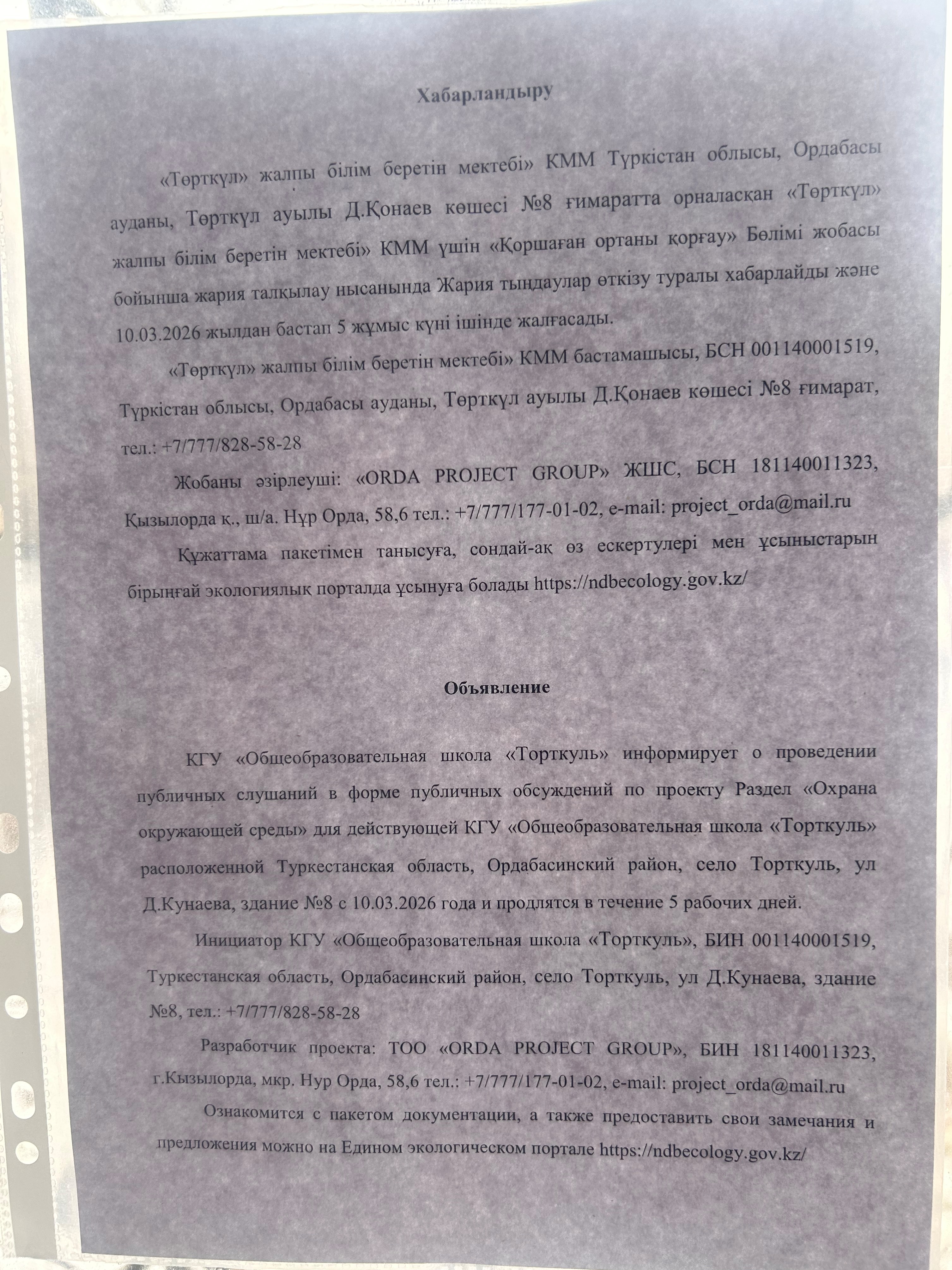По проекту: Раздел «Охрана окружающей среды» для действующей КГУ «Общеобразовательная школа «Торткуль»