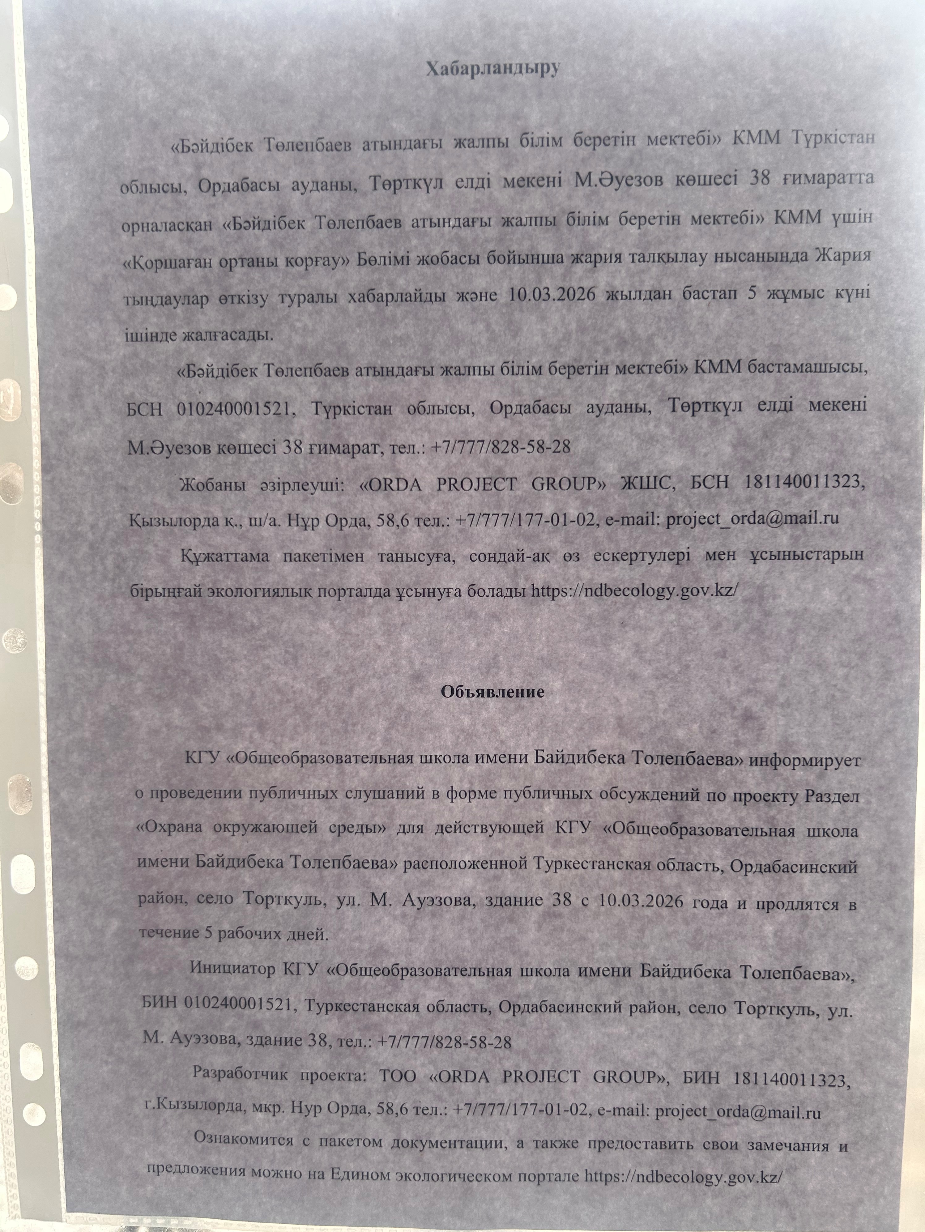 По проекту: Раздел «Охрана окружающей среды» для действующей КГУ «Общеобразовательная школа имени Байдибека Толепбаева»