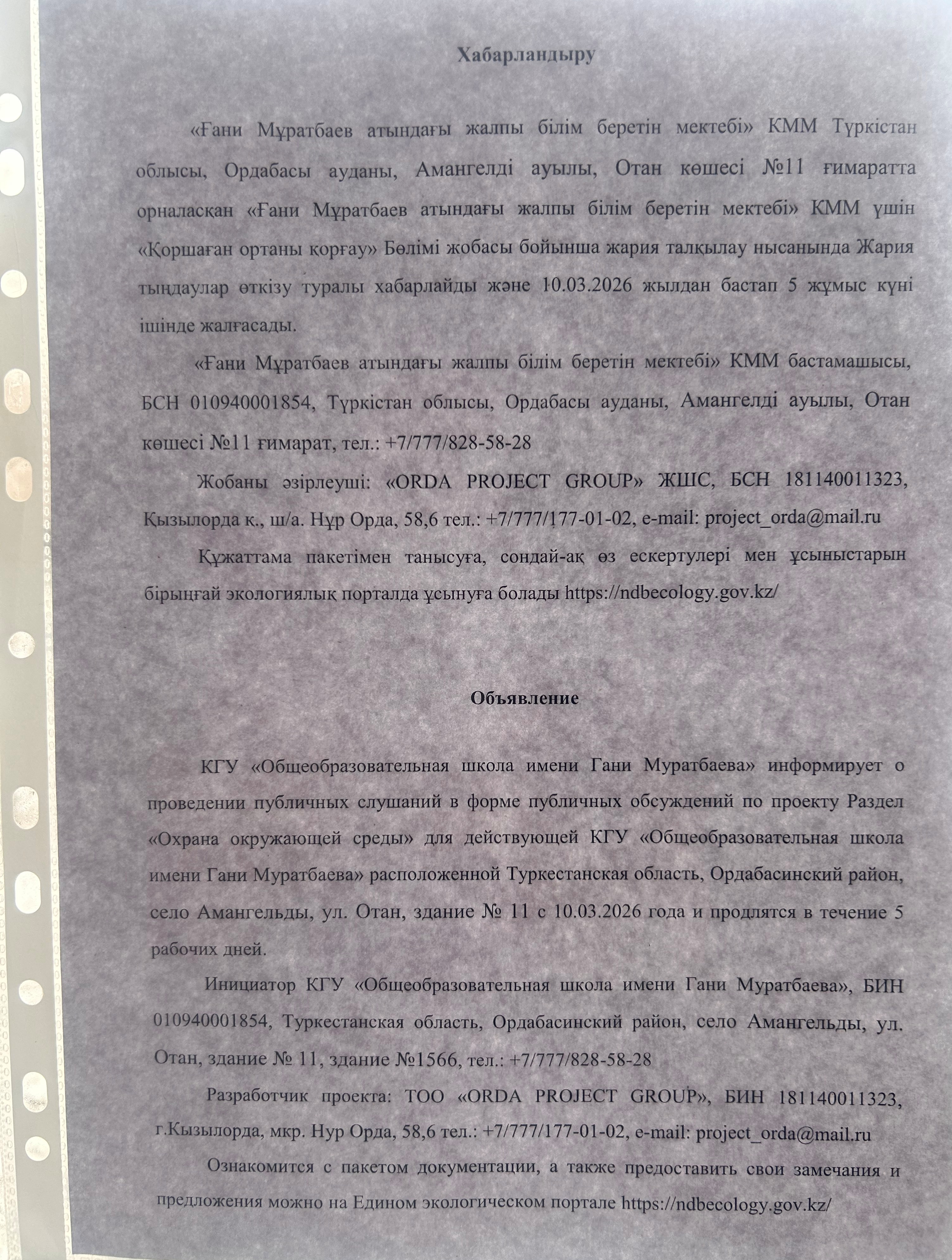 По проекту: Раздел «Охрана окружающей среды» для действующей КГУ «Общеобразовательная школа имени Гани Муратбаева»