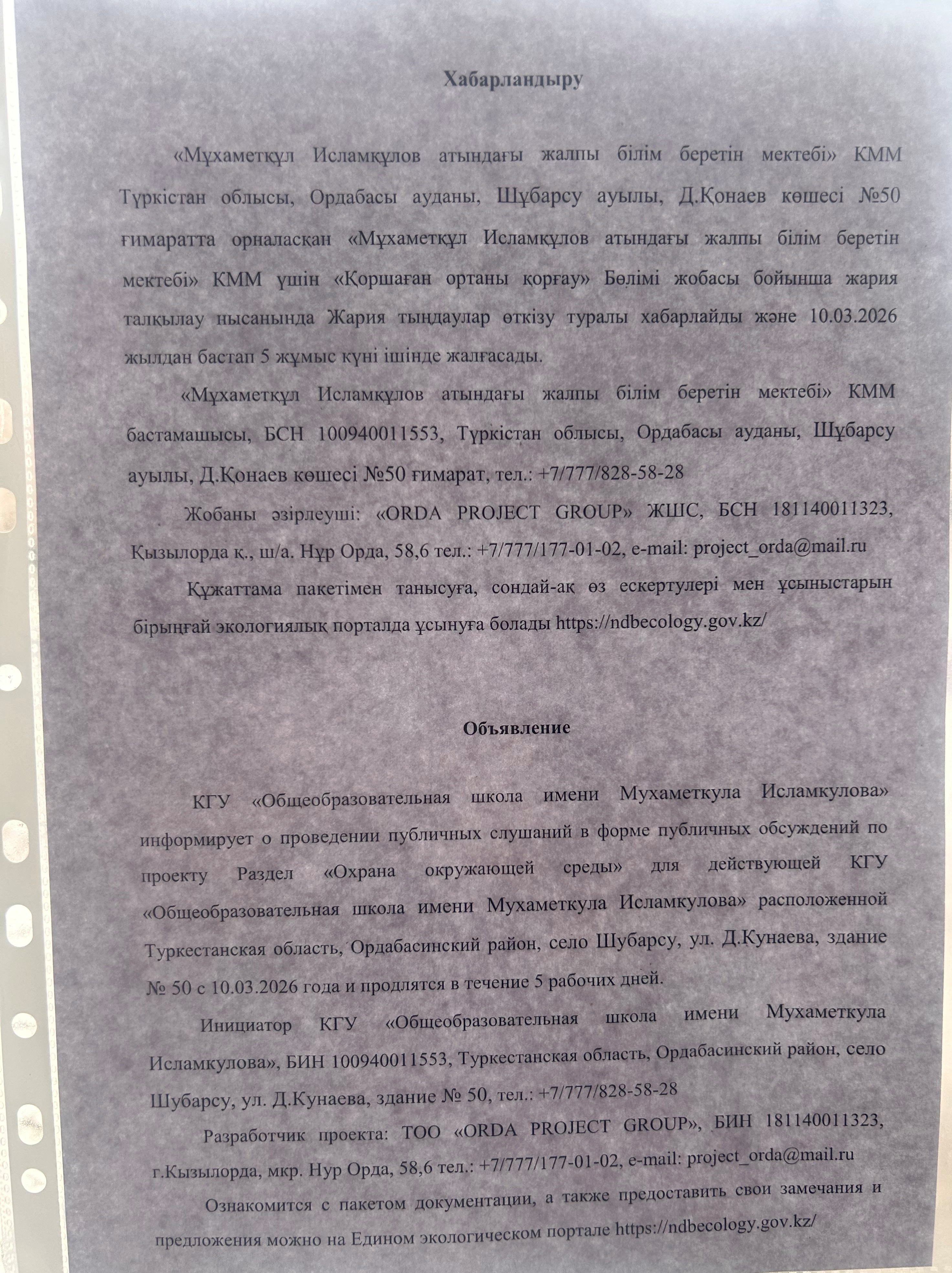 По проекту: Раздел «Охрана окружающей среды» для действующей КГУ «Общеобразовательная школа имени Мухаметкула Исламкулова»