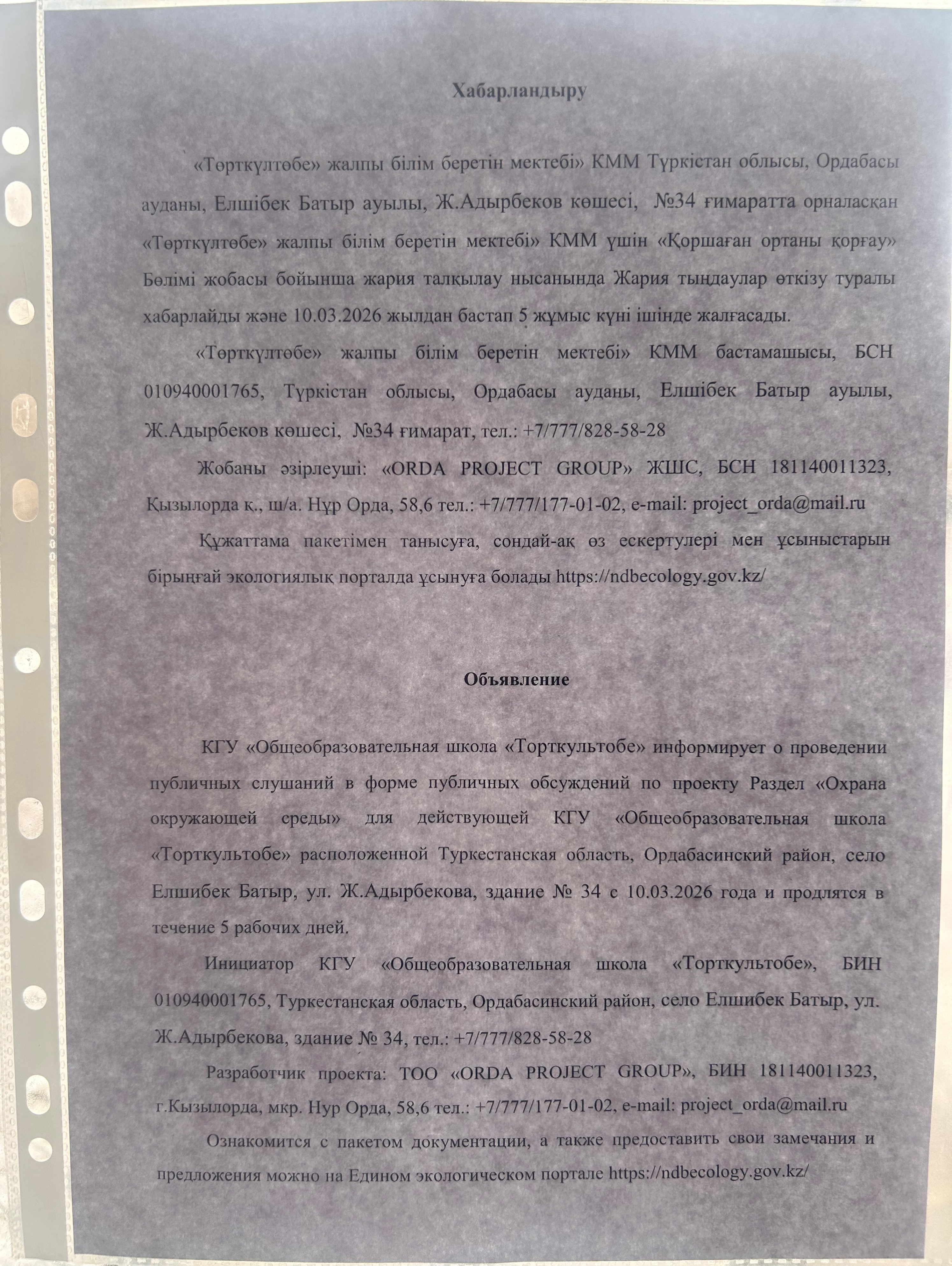 По проекту: Раздел «Охрана окружающей среды» для действующей КГУ «Общеобразовательная школа «Торткультобе»