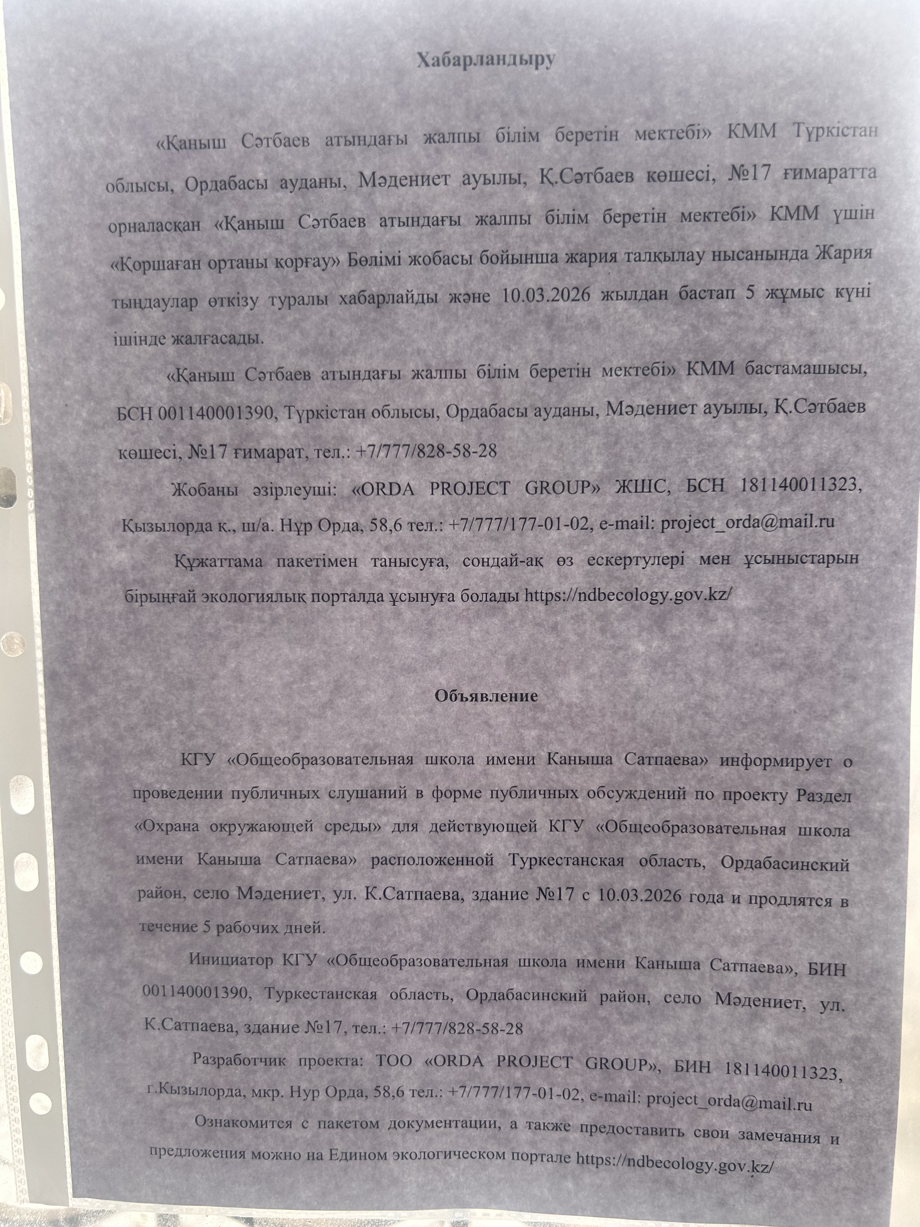 По проекту: Раздел «Охрана окружающей среды» для действующей КГУ «Общеобразовательная школа имени Каныша Сатпаева»