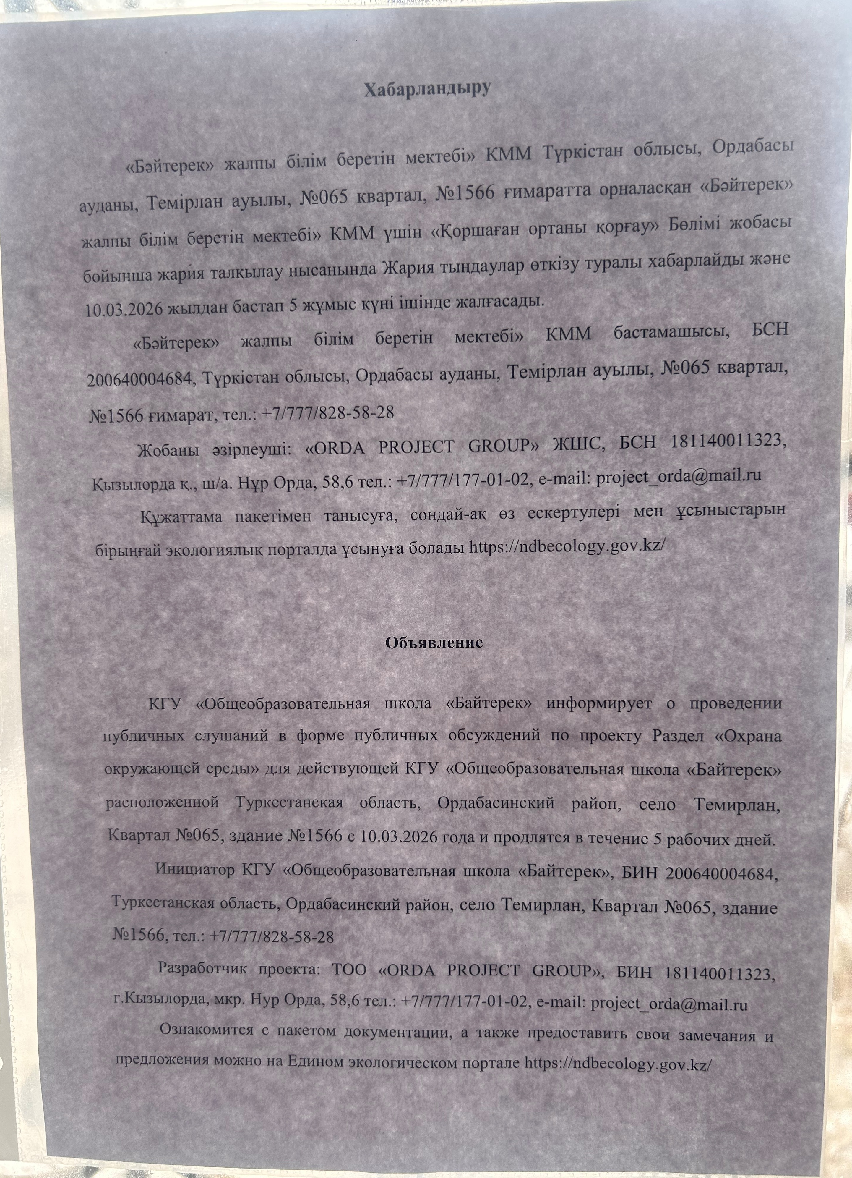 По проекту: Раздел «Охрана окружающей среды» для действующей КГУ «Общеобразовательная школа «Байтерек»