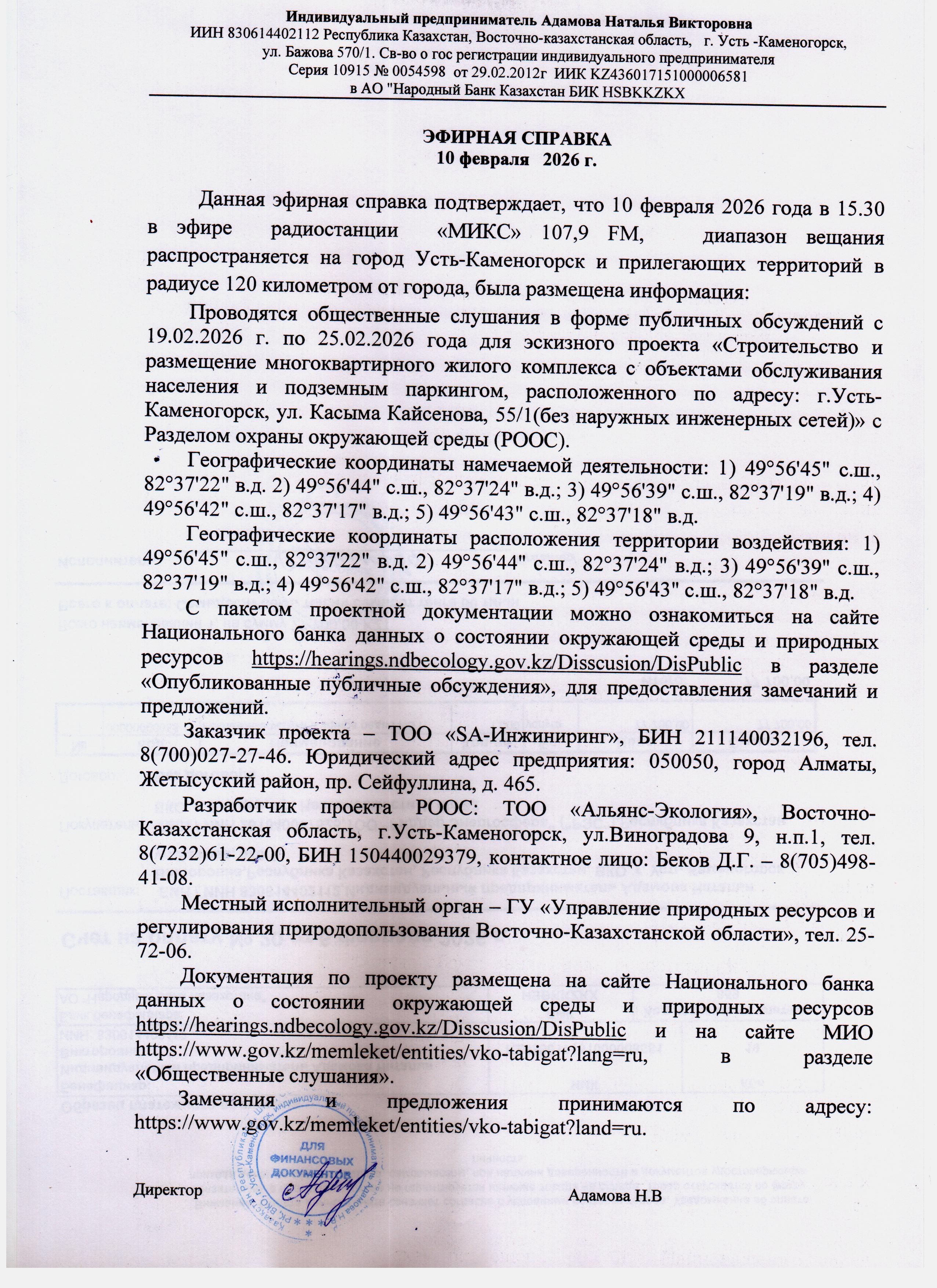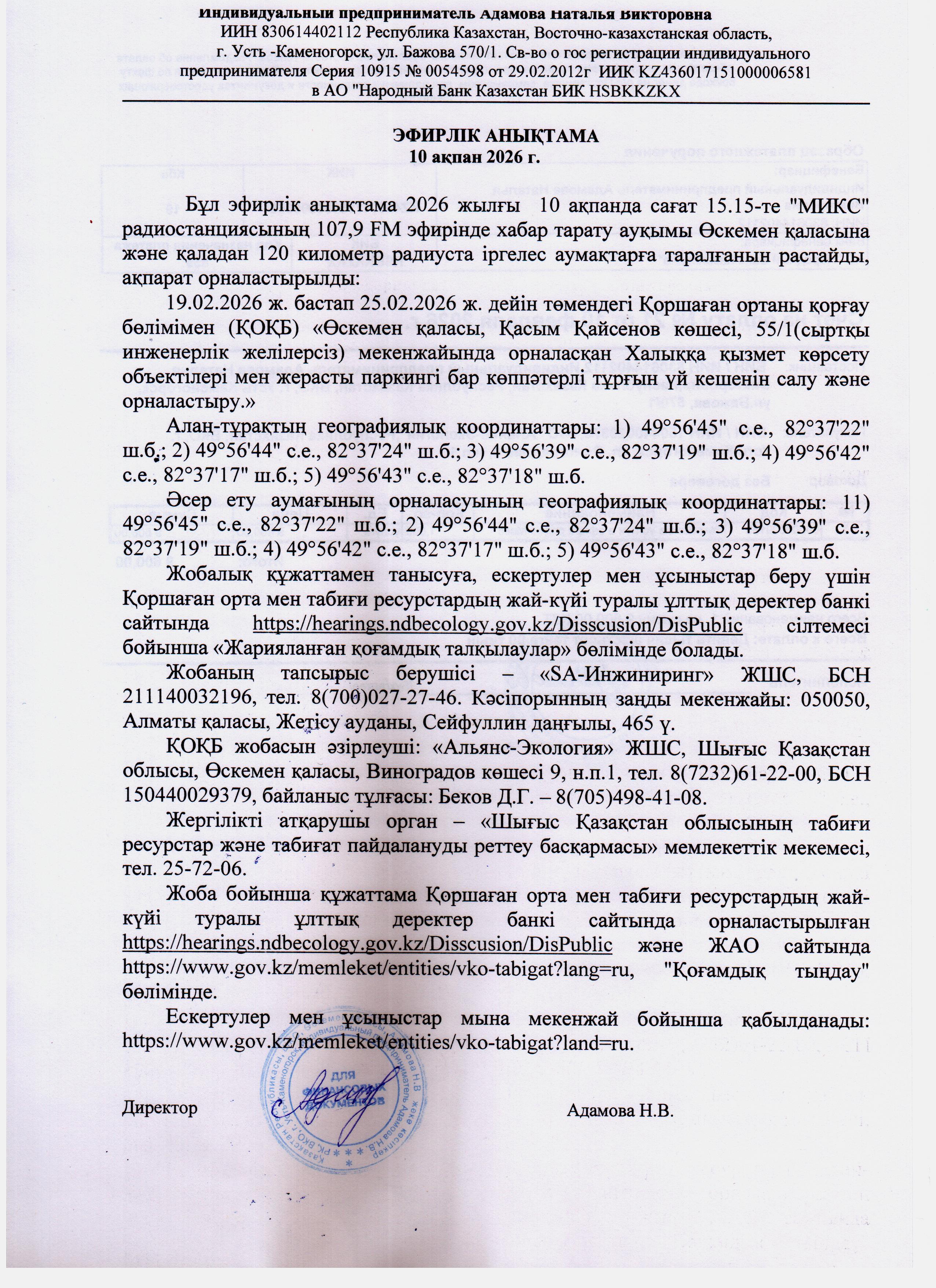 По проекту: РАЗДЕЛ «ОХРАНА ОКРУЖАЮЩЕЙ СРЕДЫ» к генеральному плану Строительство многоквартирных жилых домов по адресу г. Усть-Каменогорск, ул.Кайсенова, д.55/1