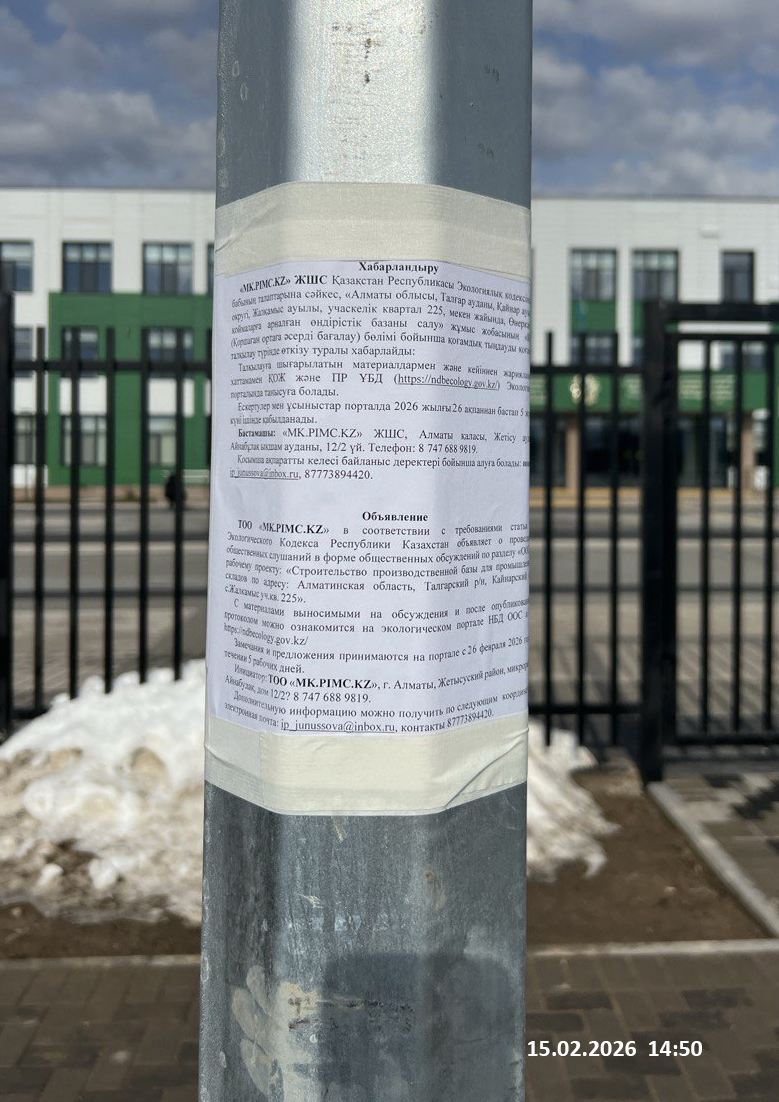 По проекту: Строительство производственной базы для промышленных складов по адресу: Алматинская область, Талгарский р/н, Кайнарский с/о, с.Жалкамыс уч.кв. 225
