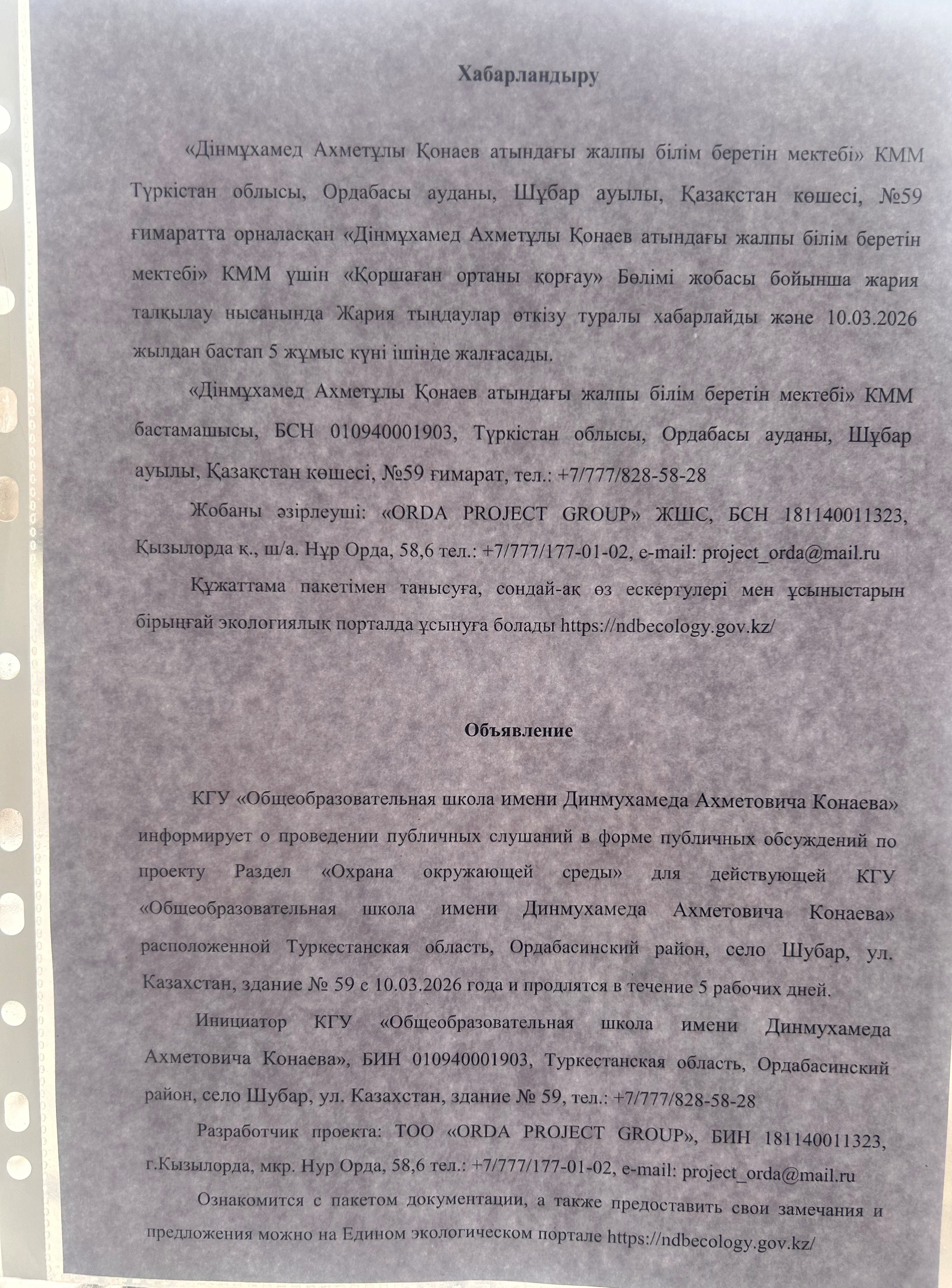 По проекту: Раздел «Охрана окружающей среды» для действующей КГУ «Общеобразовательная школа имени Динмухамеда Ахметовича Конаева»