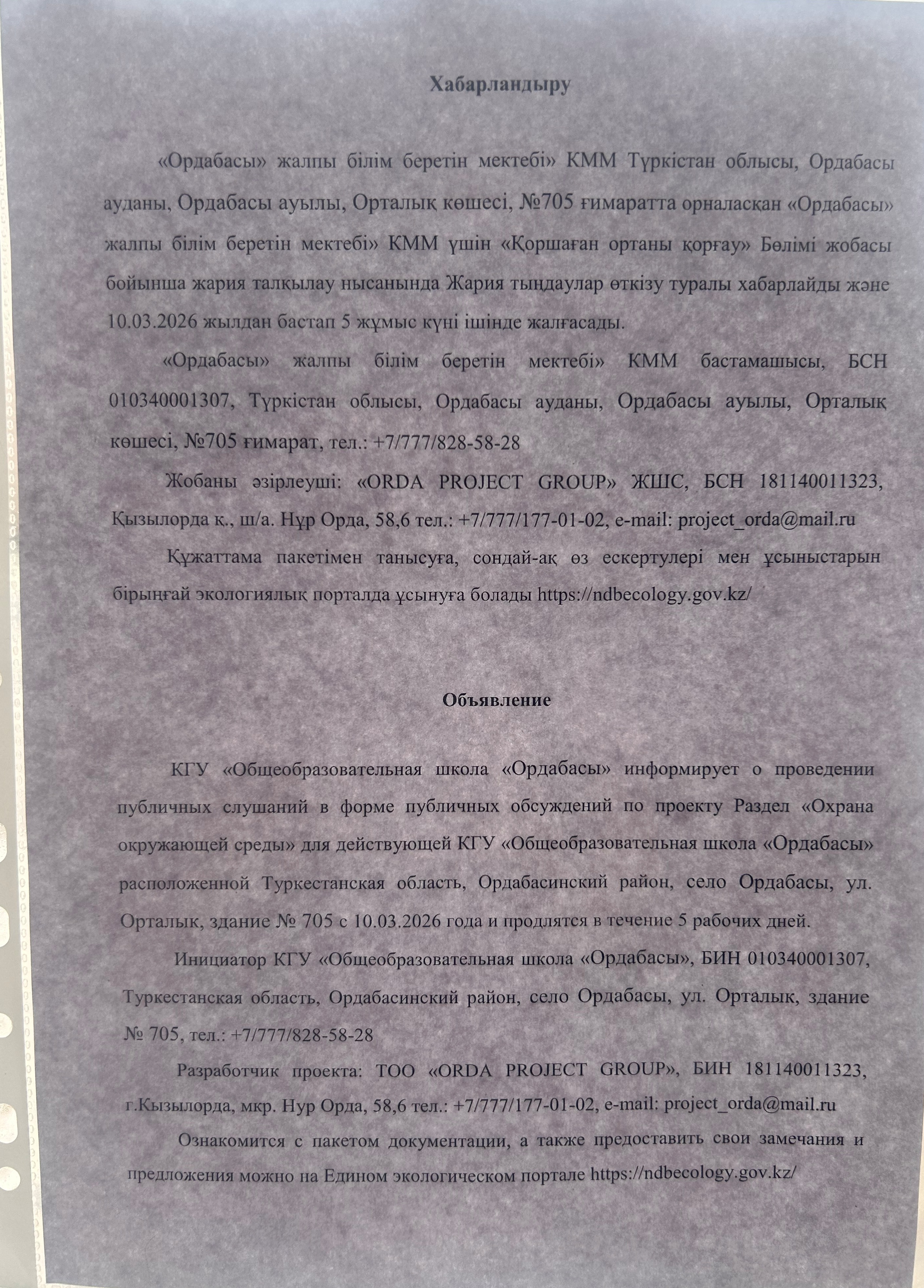 По проекту: Раздел «Охрана окружающей среды» для действующей КГУ «Общеобразовательная школа «Ордабасы»