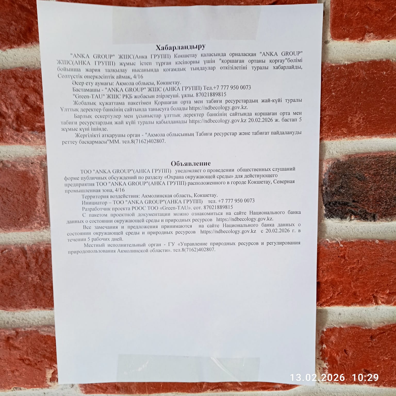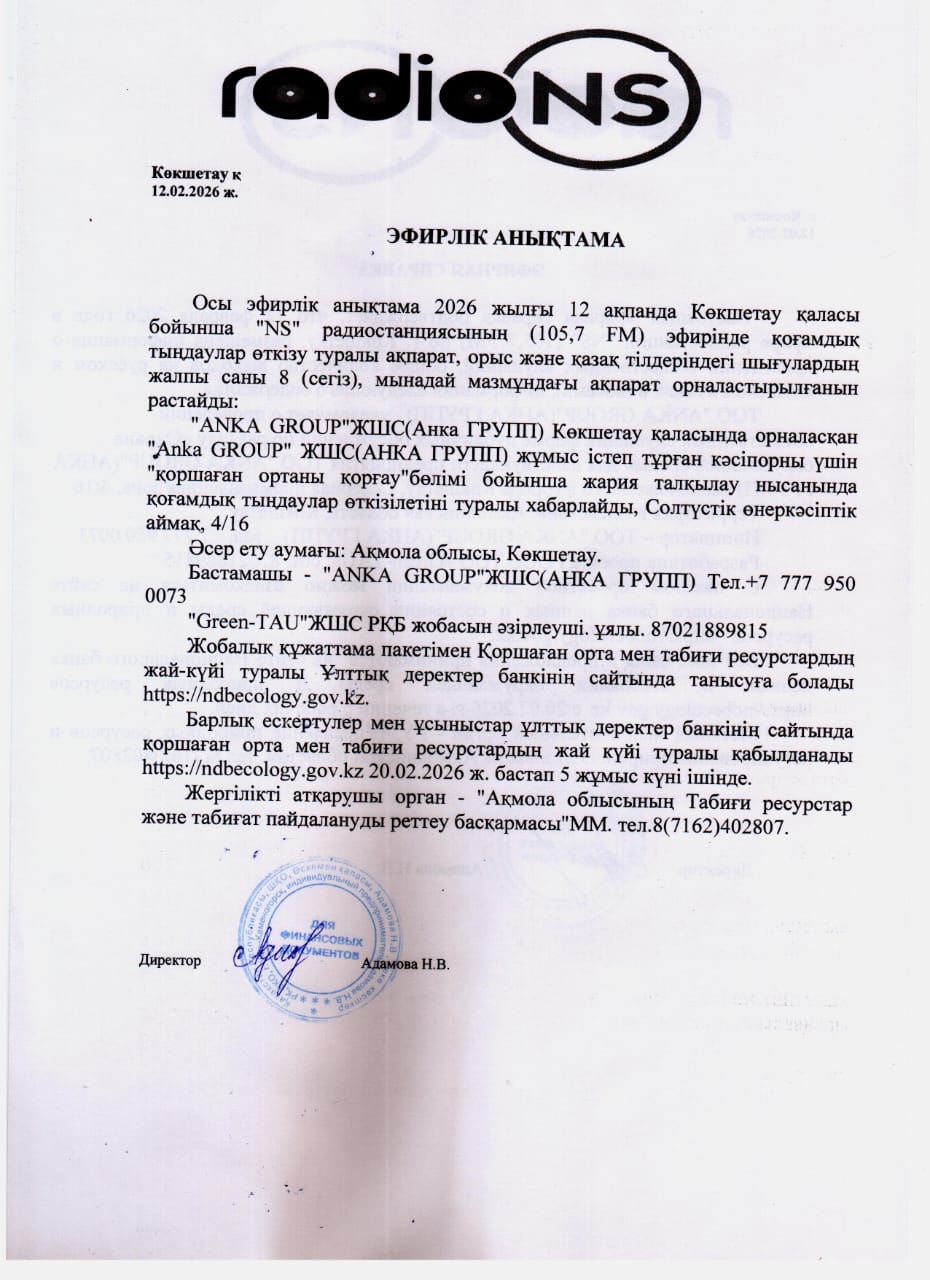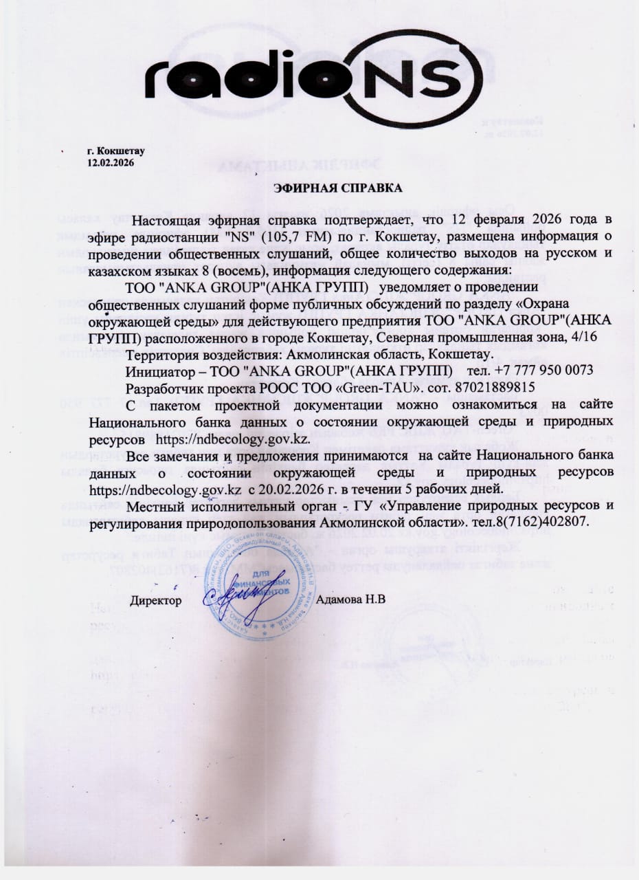 По проекту: РАЗДЕЛ «ОХРАНА ОКРУЖАЮЩЕЙ СРЕДЫ» для действующего предприятия ТОО "ANKA GROUP"(АНКА ГРУПП) расположенного в городе Кокшетау, Северная промышленная зона, 4/16