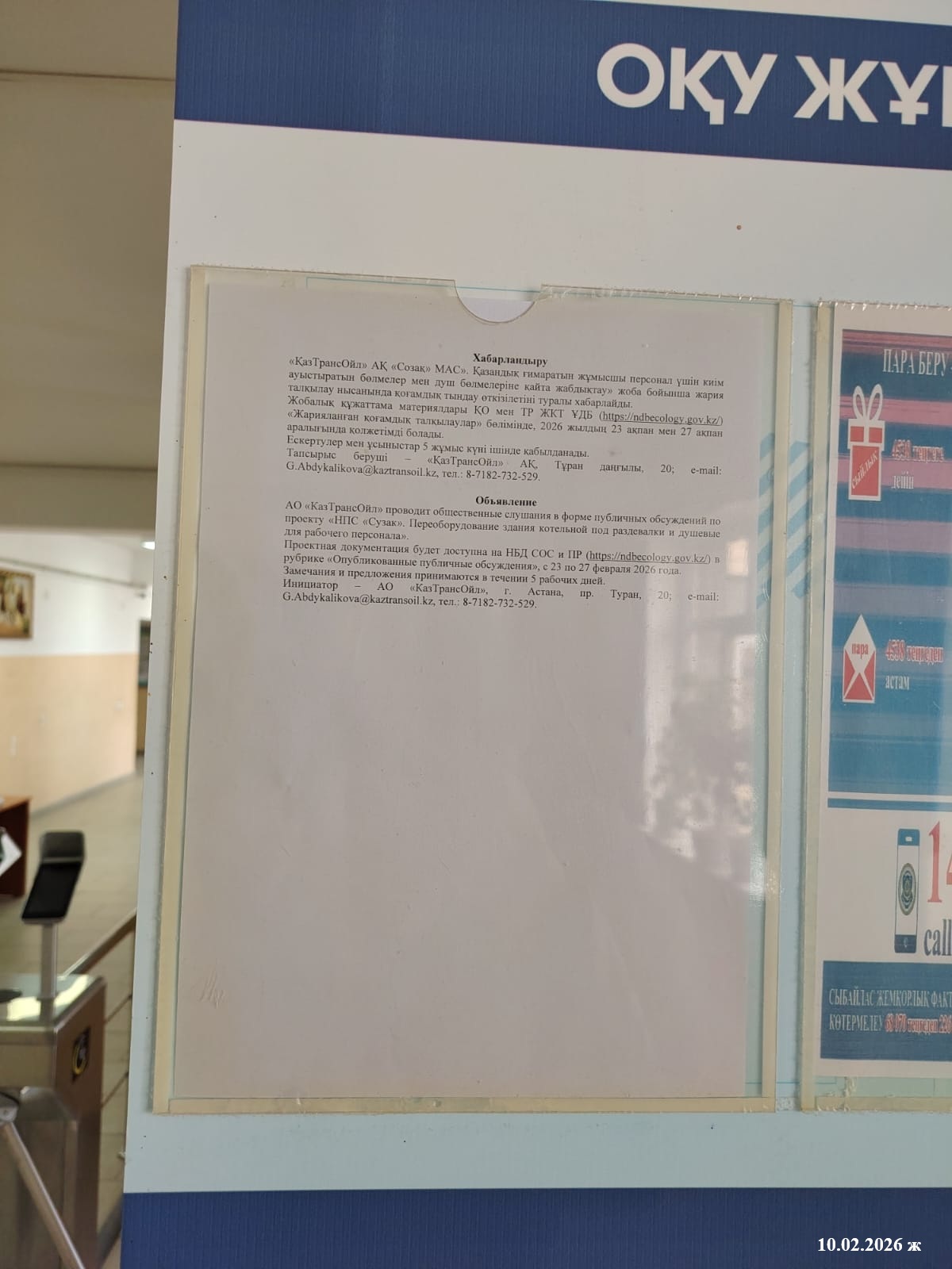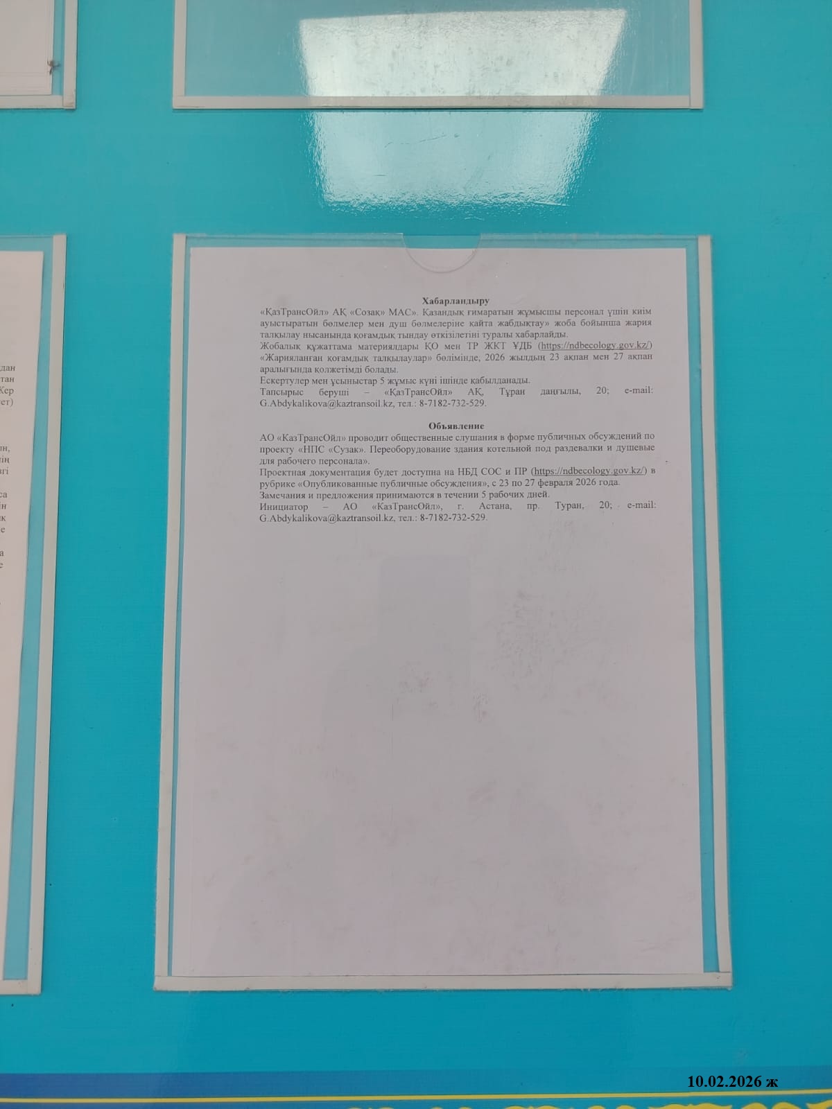 1.3. Контакты:G.Abdykalikova@kaztransoil.kz; ;