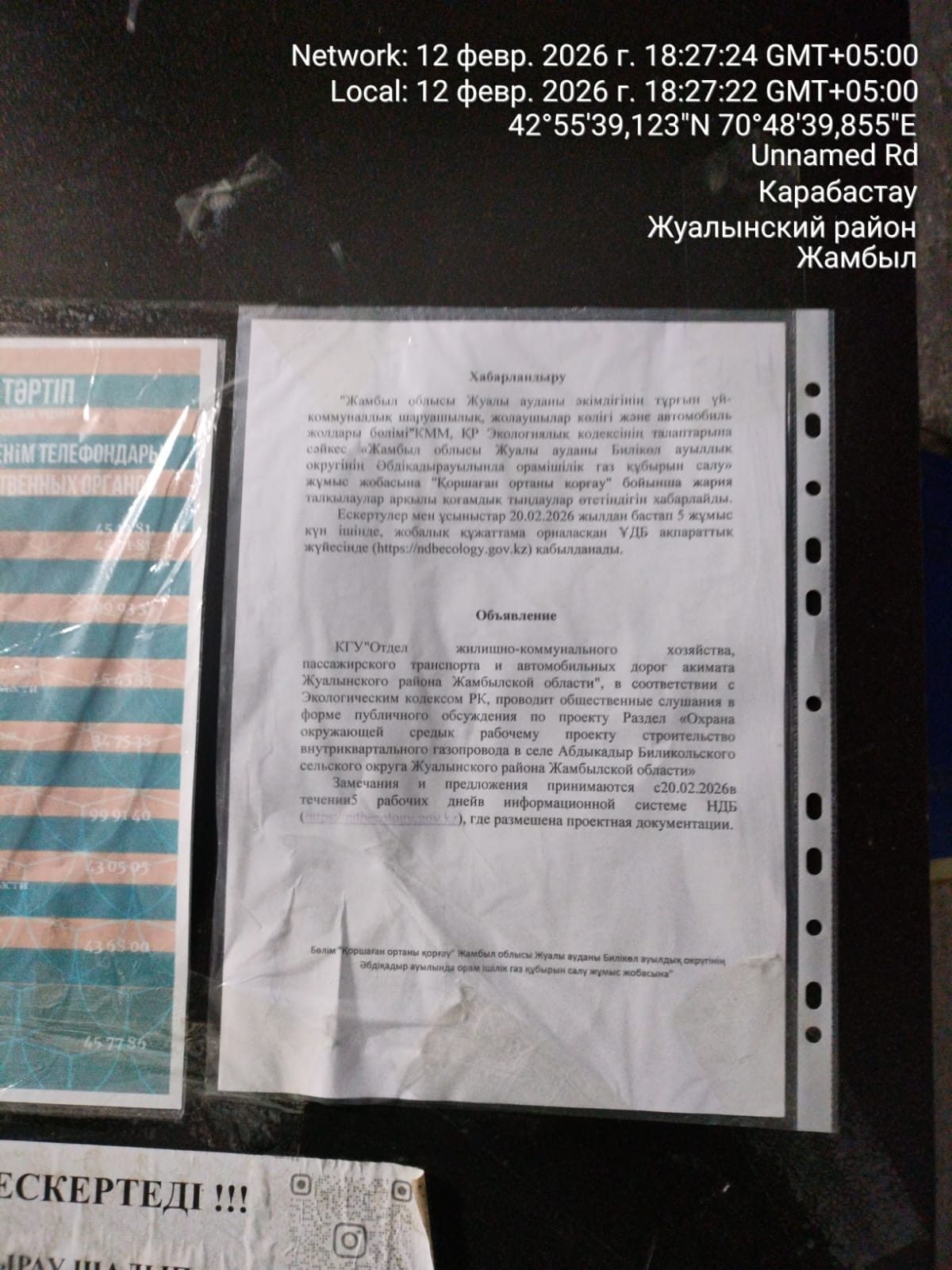 По проекту: РАЗДЕЛ«ОХРАНА ОКРУЖАЮЩЕЙ СРЕДЫ»К РАБОЧЕМУ ПРОЕКТУ СТРОИТЕЛЬСТВО ВНУТРИКВАРТАЛЬНОГО ГАЗОПРОВОДА В СЕЛЕ АБДЫКАДЫР БИЛИКОЛЬСКОГО СЕЛЬСКОГО ОКРУГА ЖУАЛЫНСКОГО РАЙОНА ЖАМБЫЛСКОЙ ОБЛАСТИ»