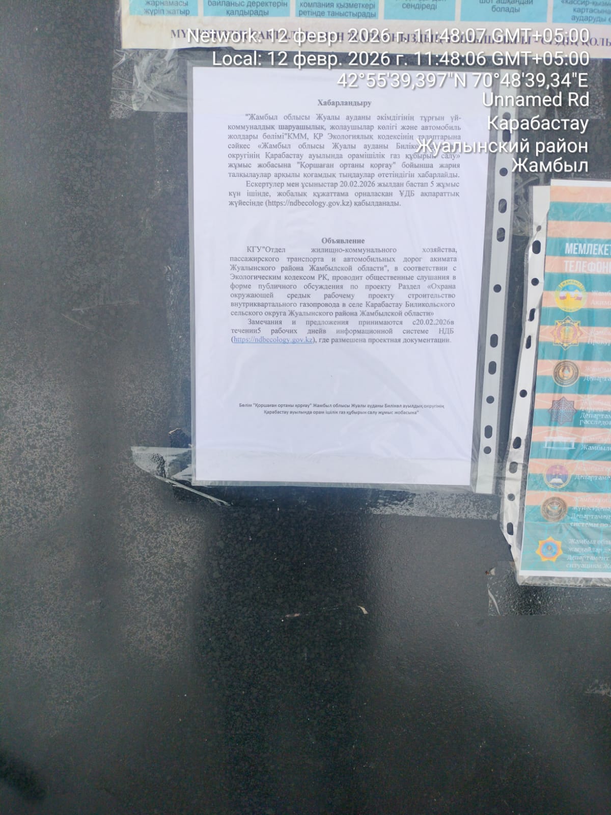 По проекту: РАЗДЕЛ «ОХРАНА ОКРУЖАЮЩЕЙ СРЕДЫ» К РАБОЧЕМУ ПРОЕКТУ СТРОИТЕЛЬСТВО ВНУТРИКВАРТАЛЬНОГО ГАЗОПРОВОДА В СЕЛЕ КАРАБАСТАУ БИЛИКОЛЬСКОГО СЕЛЬСКОГО ОКРУГА ЖУАЛЫНСКОГО РАЙОНА ЖАМБЫЛСКОЙ ОБЛАСТИ»