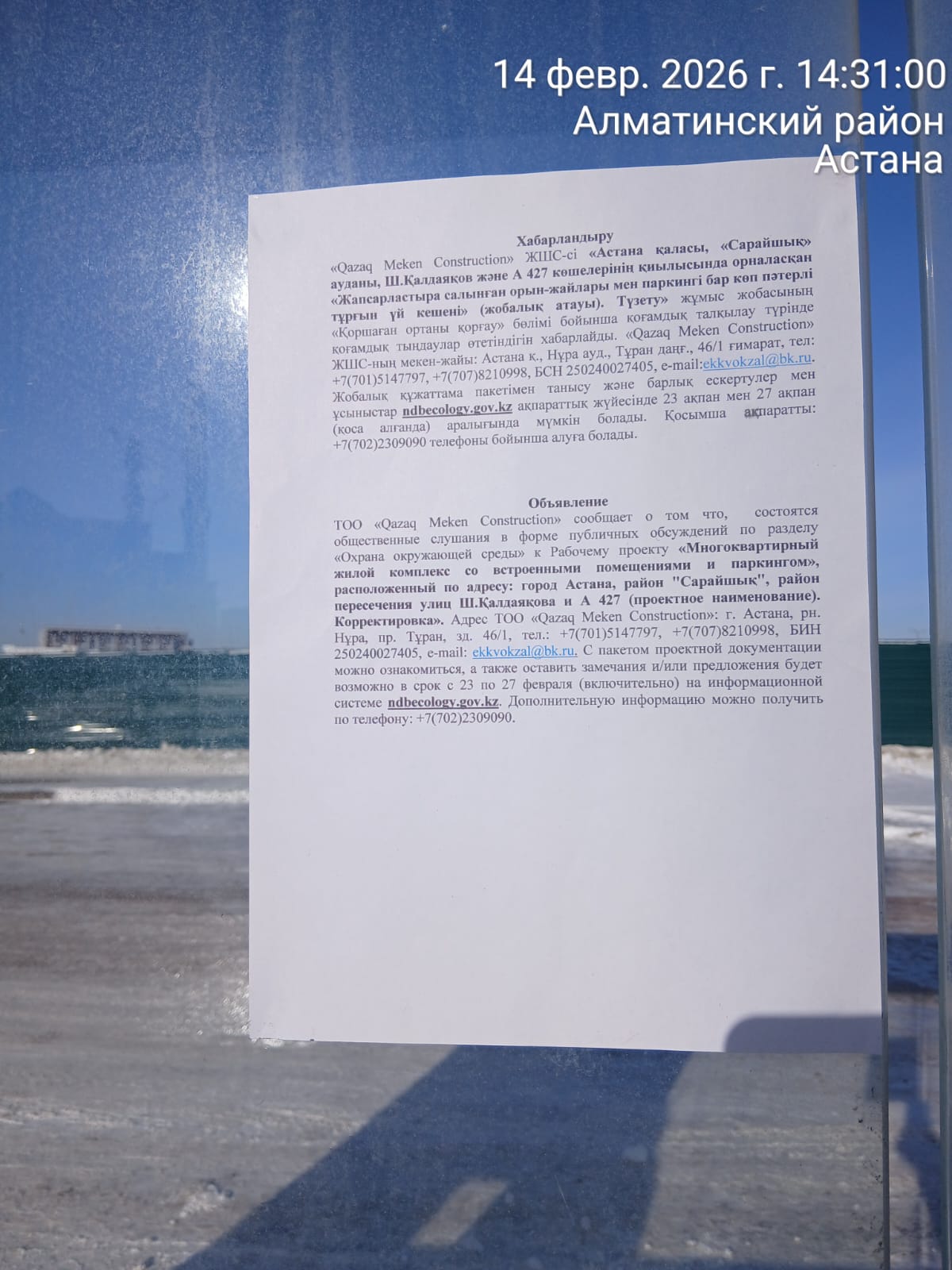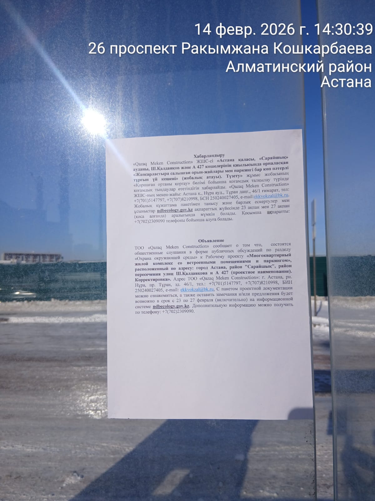 По проекту: Проект РООС «Многоквартирный жилой комплекс со встроенными помещениями и паркингом», расположенный по адресу: город Астана, район "Сарайшық", район пересечения улиц Ш.Қалдаяқова и А 427 (проектное наименование). Корректировка»