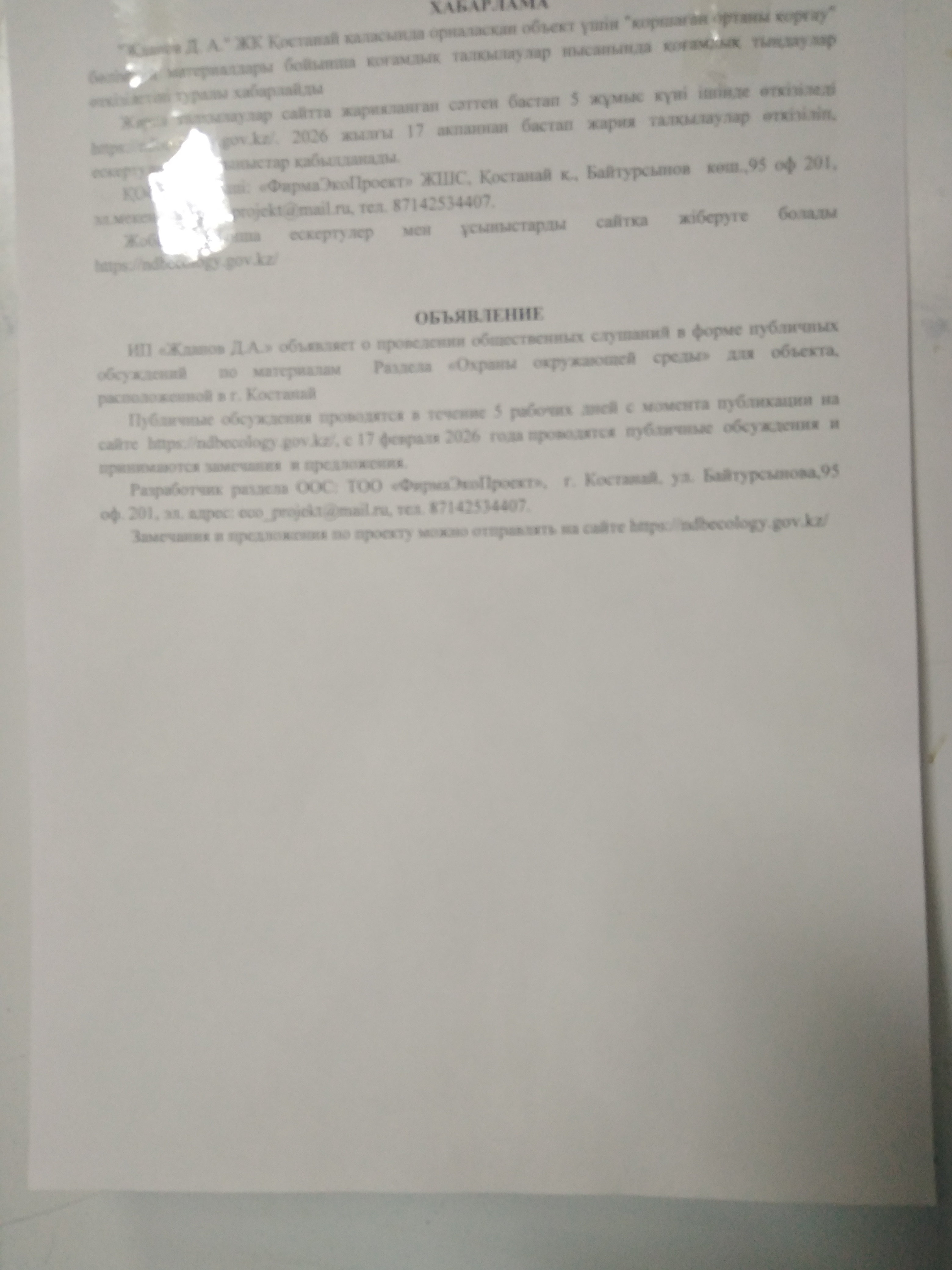 По проекту: Раздела «Охраны окружающей среды» для объекта, расположенной в г. Костанай